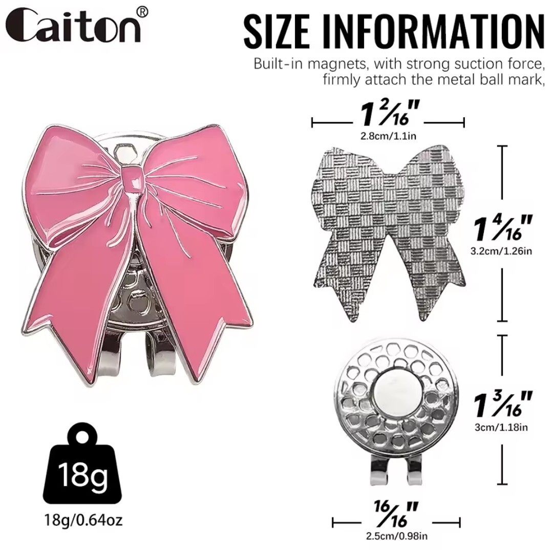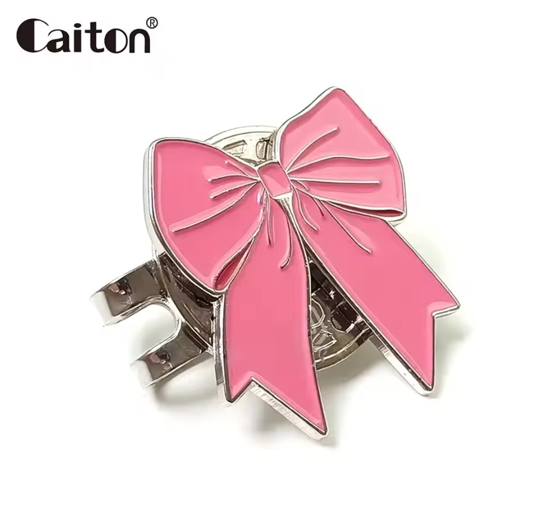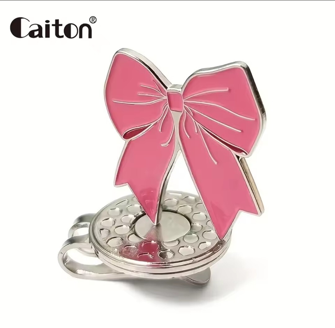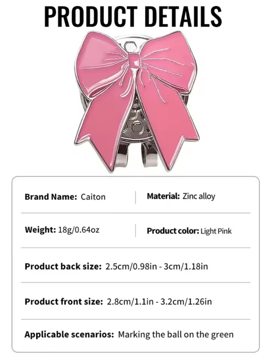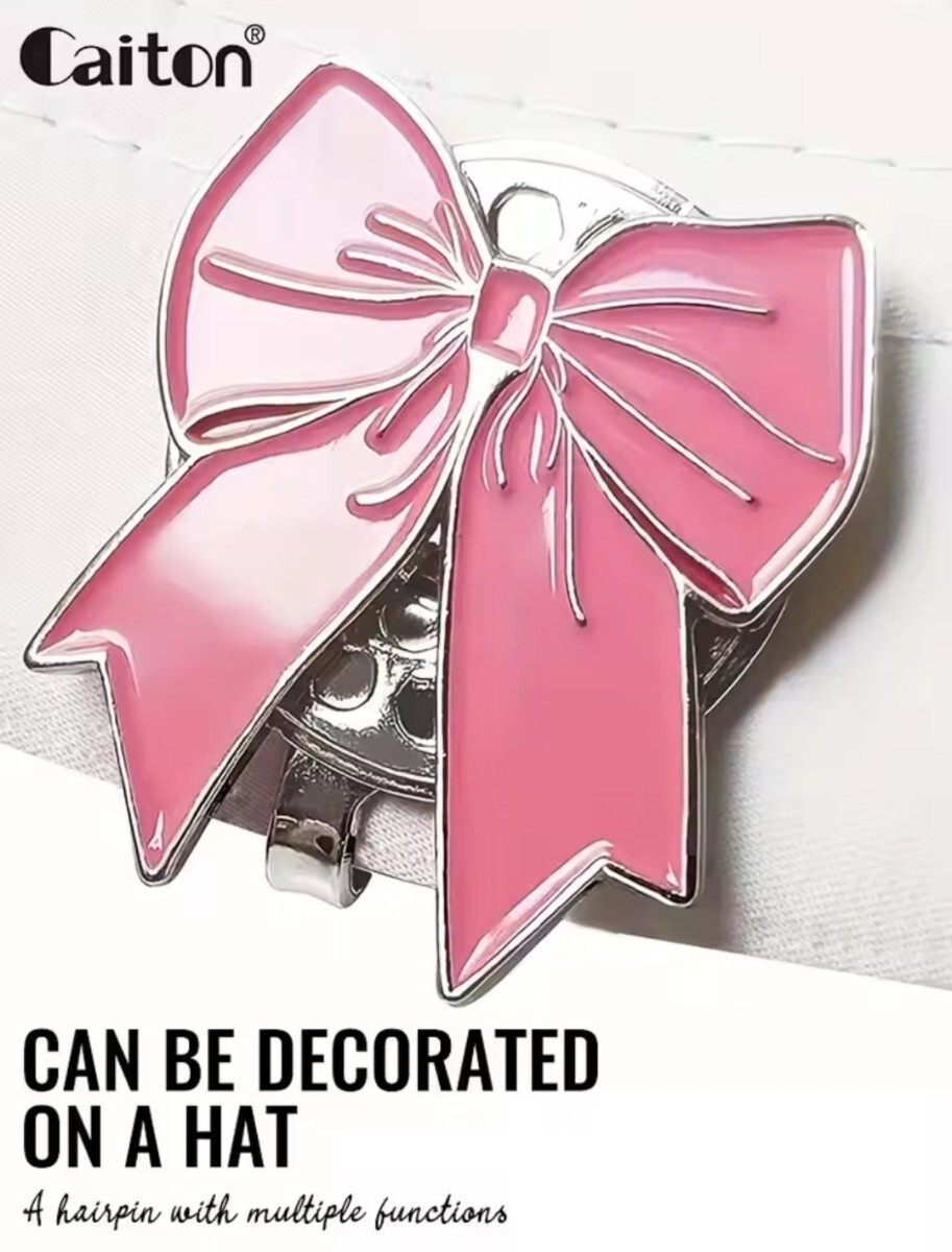 大きなピンクのリボンが目を引く、可愛らしいゴルフボールマーカーです。