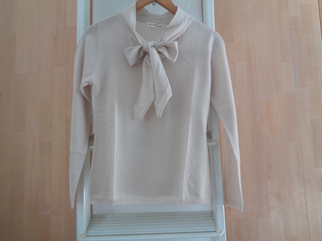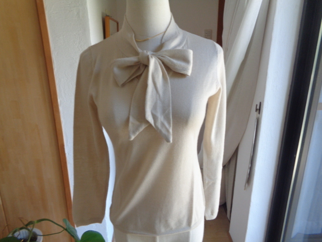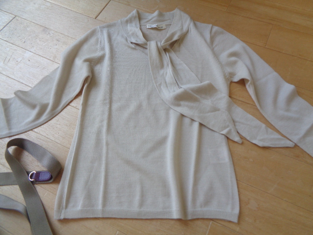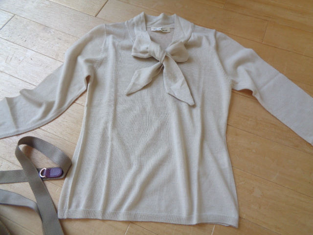 STRAWSERRY FIELDS リボン結びデザイン 薄手ウール 七分袖 ニットカットソー 上品 ベージュ系 美品♪