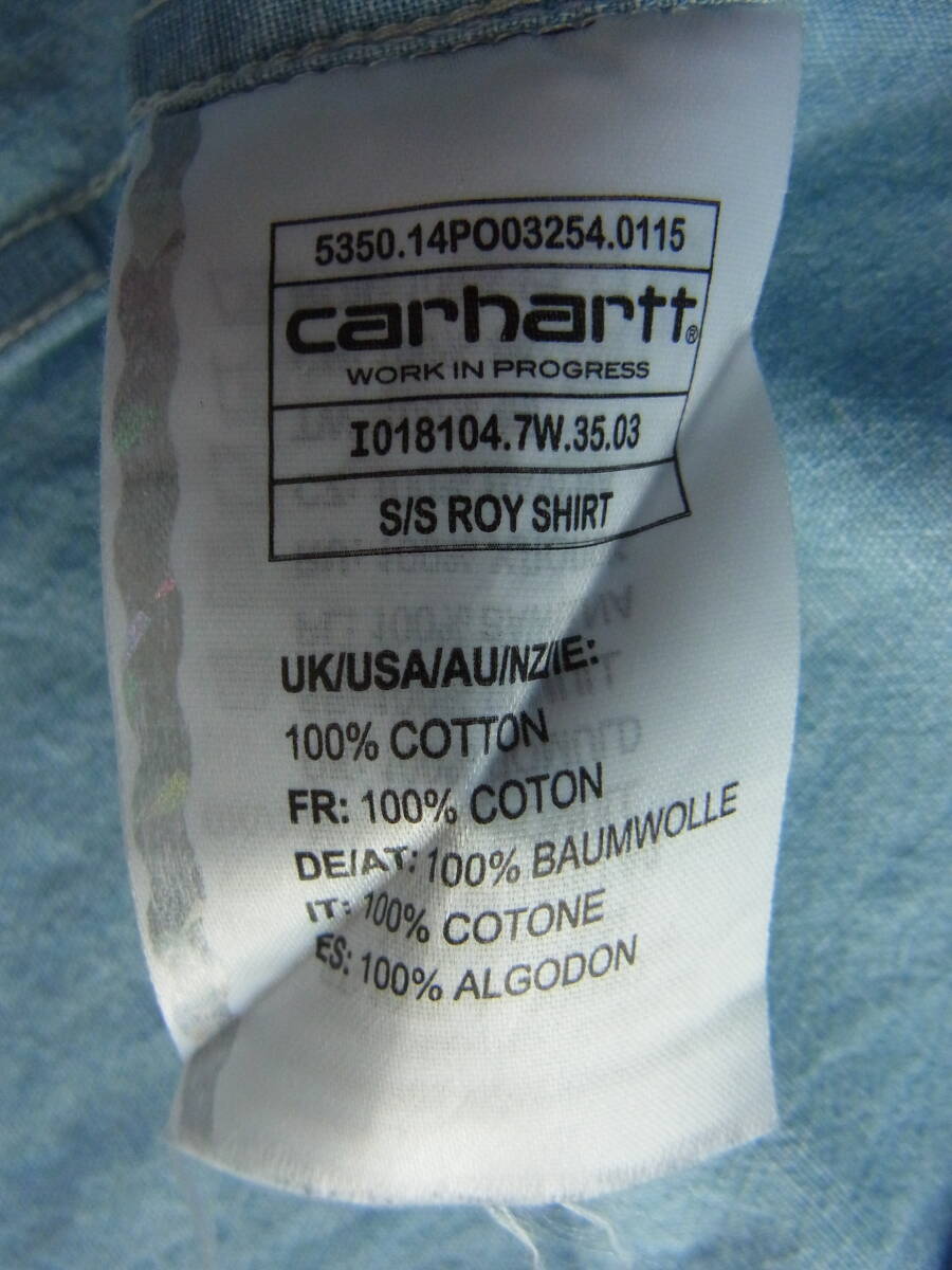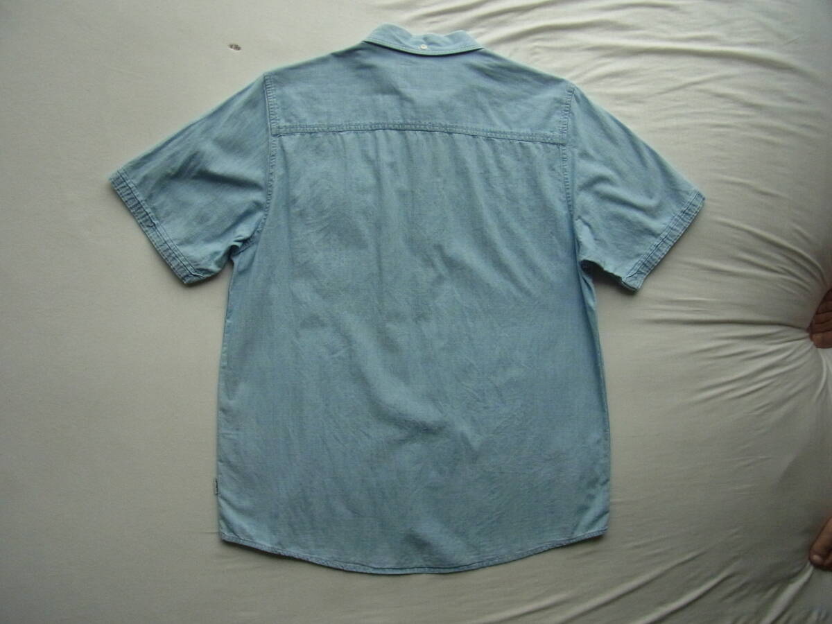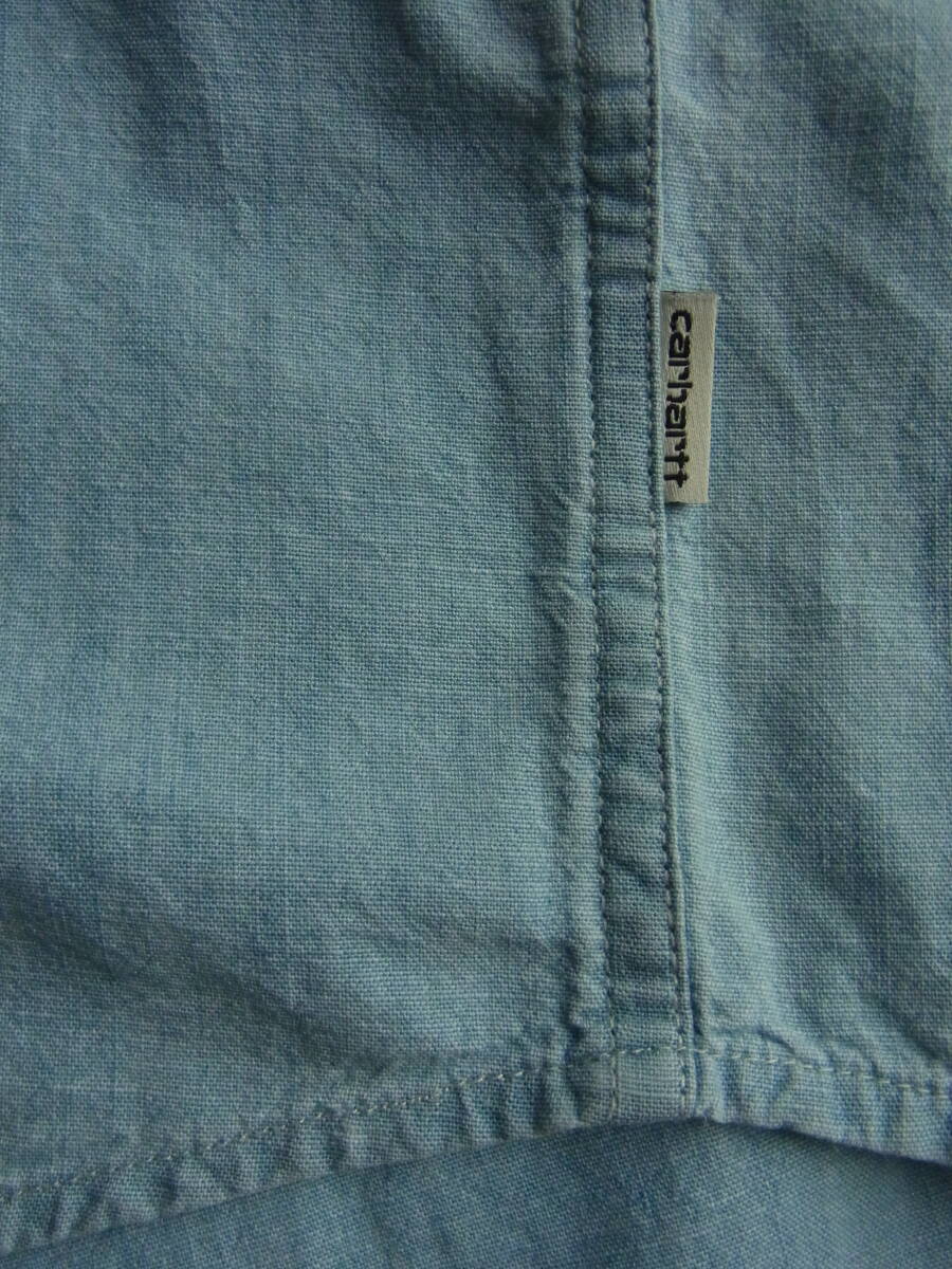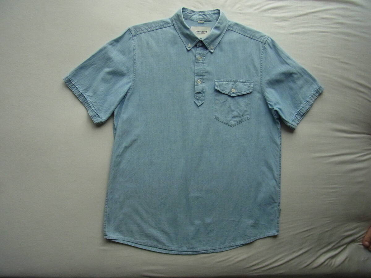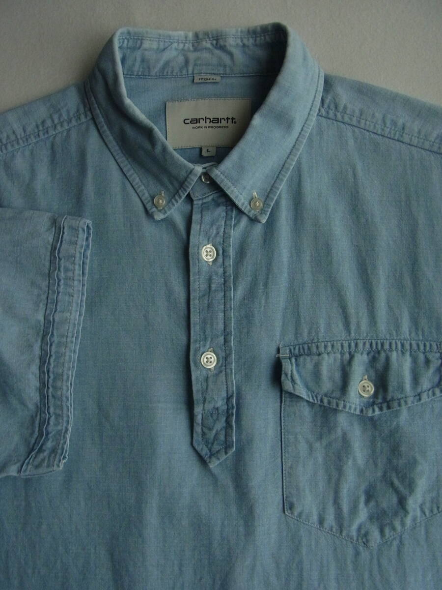 カーハートのインディゴシャンブレー素材でプルオーバーの半袖ボタンダウンシャツになります。USEDで着用感と、衿部分に7枚目の画像の様な色褪せは御座いますが、それ以外には特に目立ったダメージ等は御座いません。