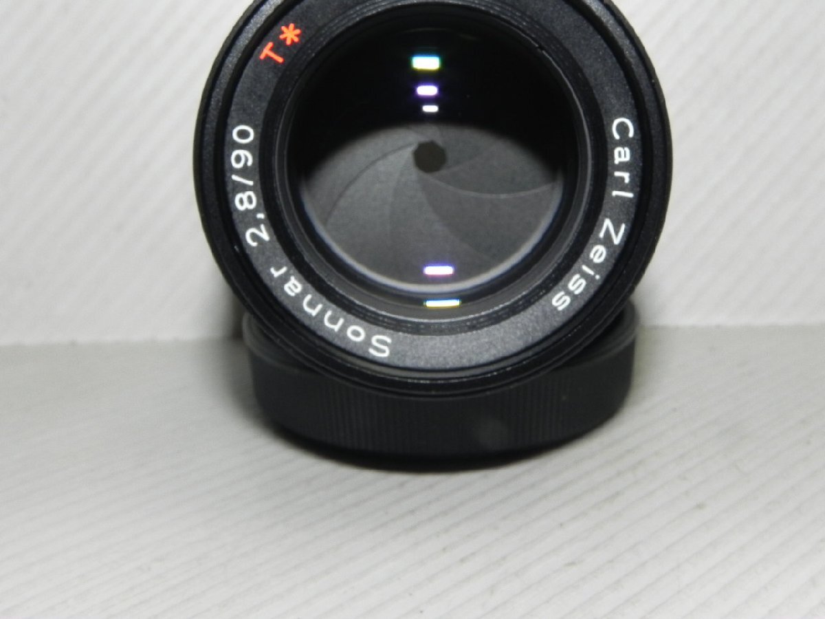 Carl Zeiss Contax コンタックス ゾナー T* Sonnar 90mm/2.8 レンズ(ブラック)(830)。仕様:CONTAX Gシ-リズ用レンズ。品物は動作品です、外観に少スレ、小傷があり、レンス゛にはカビがありません、前玉に擦り傷、中玉に埃、小ゴミがあり、中古品です。付属品は本体、蓋(社外品)、キャップのみです。