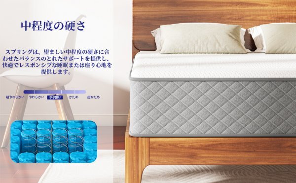 【高反発スプリングマットレス】: ポケットコイルとメモリーフォームを組み合わせ、ボリューム感と快適な安定感を贅沢に堪能できます。適度な弾力がある高反発マットレスは、自然な姿勢でリラックスして眠れるタイプで、特に腰回りが沈み込みすぎないため、寝返りがしやすく、バランスの取れた寝心地を提供します。硬めの寝具を好む方や、しっかりとしたサポートを求める方に最適です。