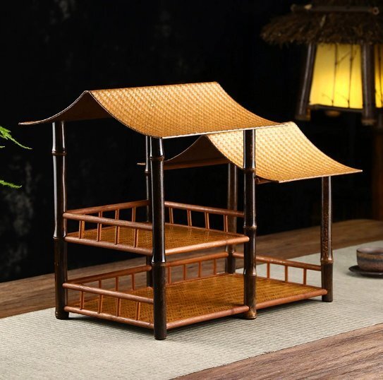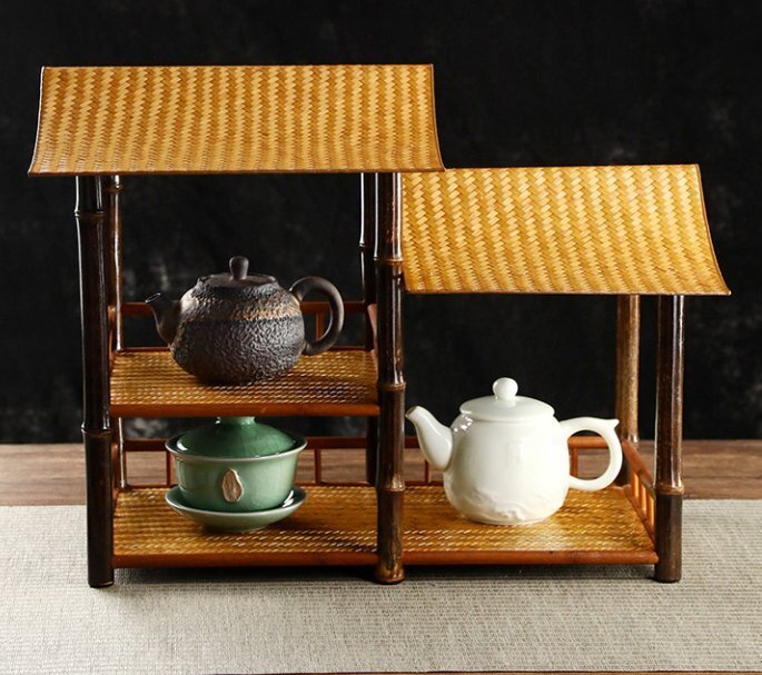 竹製品畳面茶棚中国式囲炉裏煮茶禅意梅鹿竹軒置物収納棚二重湯飲み棚