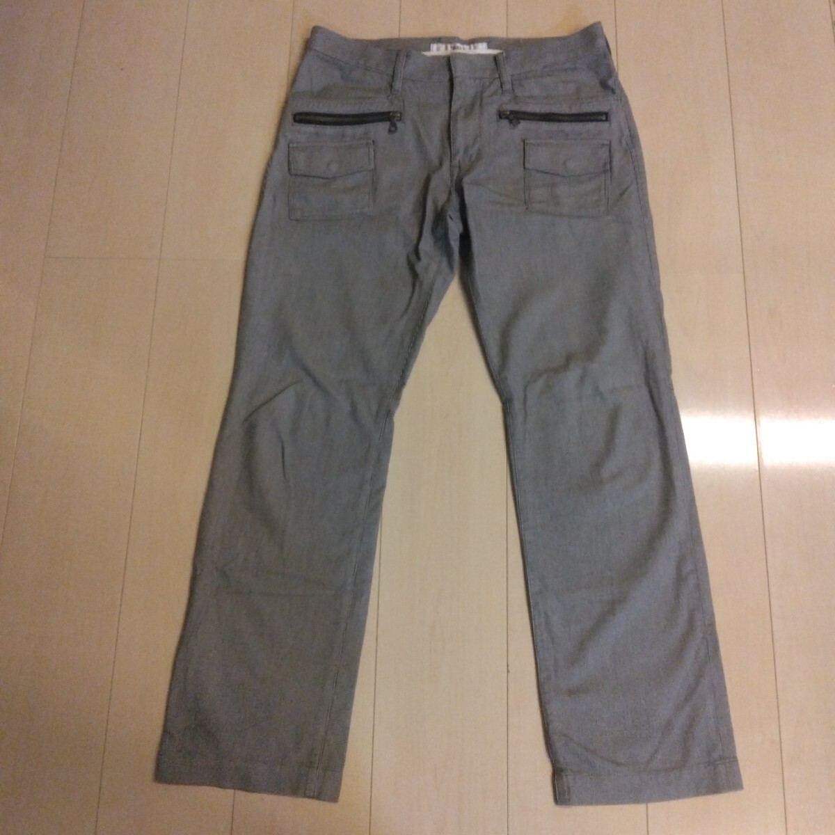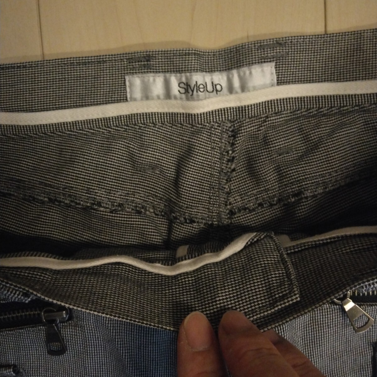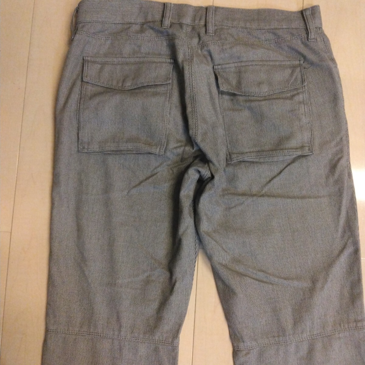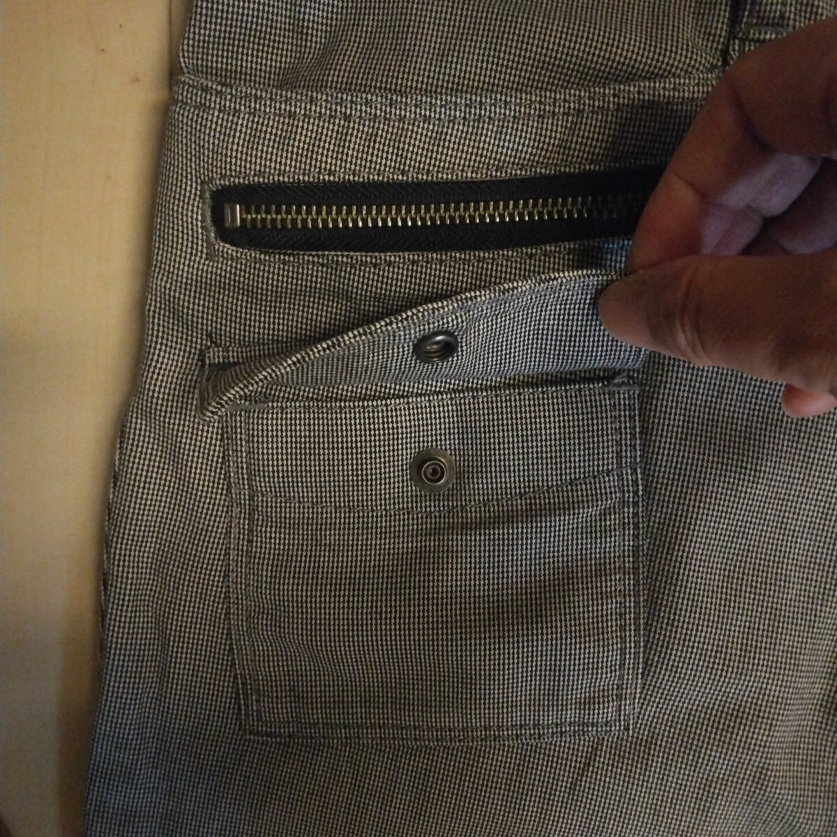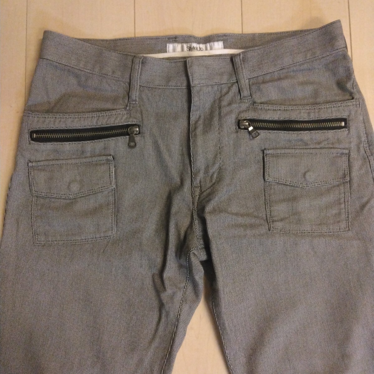 ・千鳥格子のような小さな黒白のチェック柄と前ファスナー付きポケットがアクセントのパンツです。
