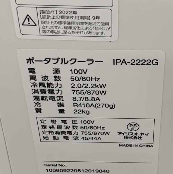 アイリスオーヤマ ポータブルクーラー IPA-2222G 2022年製 スポットクーラー 移動式エアコン ホワイト スポットエアコン 札幌市内近郊限定 札幌市 北区 屯田店