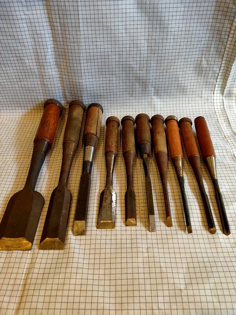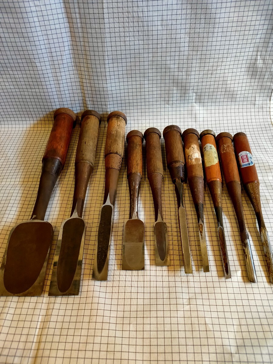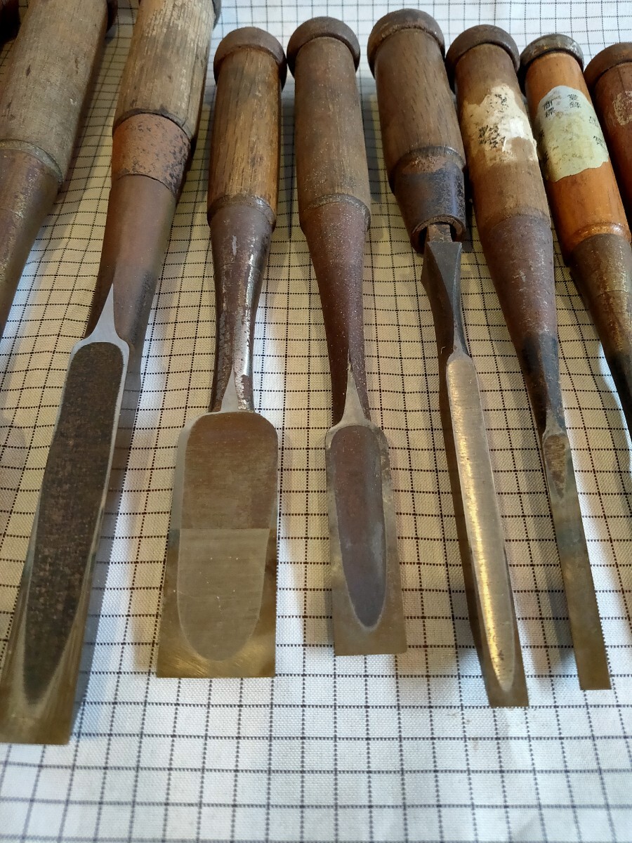 大工さんが使っていた道具です。委託品なので詳しいことは分かりません。刃渡りのサイズは写真左から、49mm・30mm・15mm・24mm・14mm・75mm・6mm・5.5mm・10mm(先が丸くなっています)・8mm(先が丸くなっています)です。古い物ですのでその点をご理解頂き御検討頂きますようお願い致します。