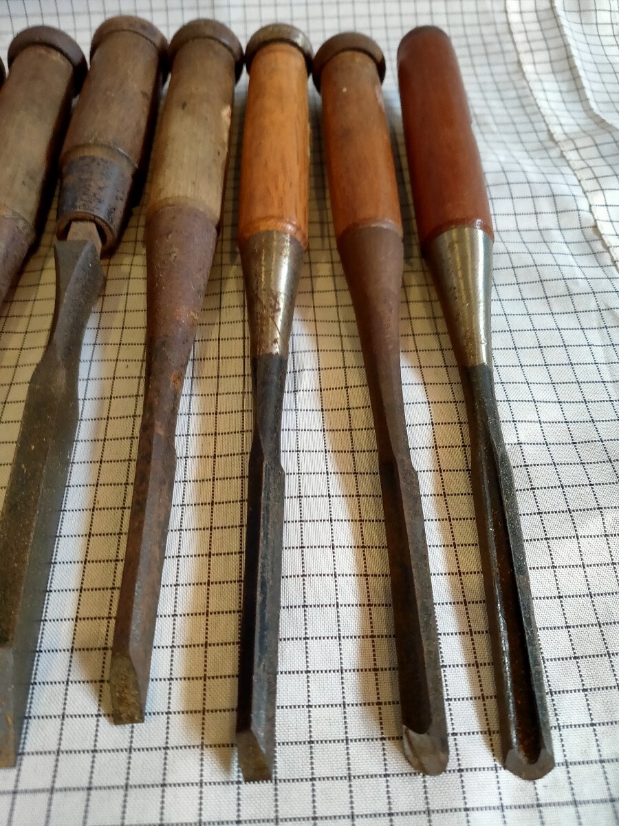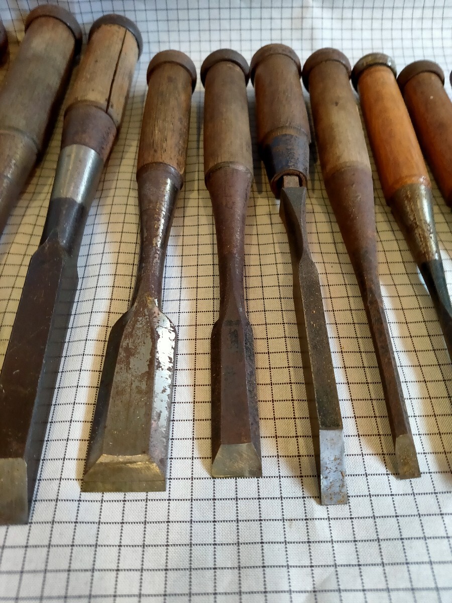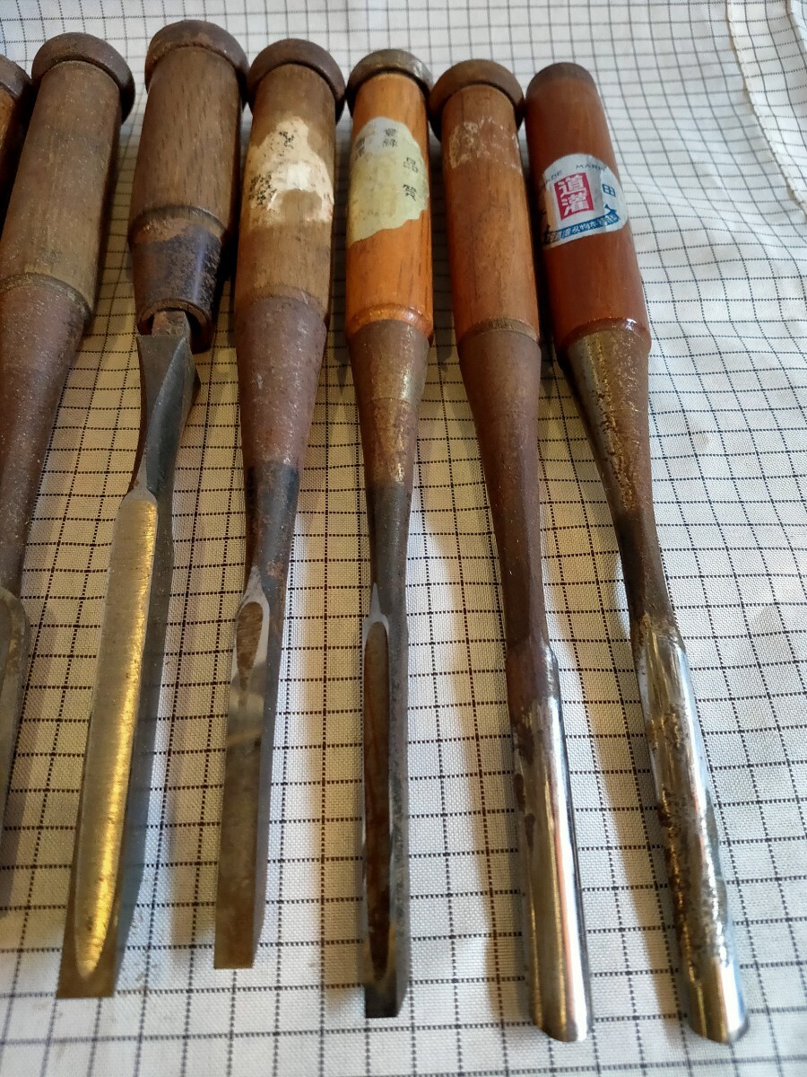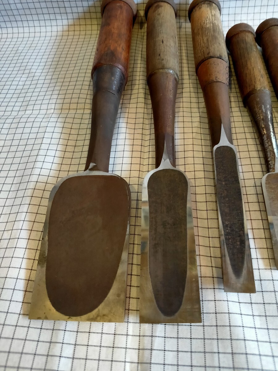 大工さんが使っていた道具です。委託品なので詳しいことは分かりません。刃渡りのサイズは写真左から、49mm・30mm・15mm・24mm・14mm・75mm・6mm・5.5mm・10mm(先が丸くなっています)・8mm(先が丸くなっています)です。古い物ですのでその点をご理解頂き御検討頂きますようお願い致します。