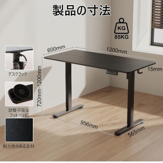 【電動昇降式デスク仕様】天板:幅120cmx奥行60cmx厚さ1.5cm 昇降範囲:72cm〜120cm 昇降速度:25mm/s 耐荷重:85㎏ 騒音値:
