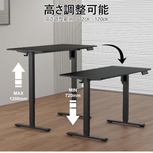 【高さ調整機能】スタンディングデスクは72cmから120cmまでの高さ調整が可能で、身長や作業内容に合わせたカスタマイズができます。さらに、メモリー機能により、よく使用する高さを3つまで保存でき、ワンタッチで好きな高さに戻すことができます。家庭やオフィス、書斎など、さまざまなシーンで活躍します。