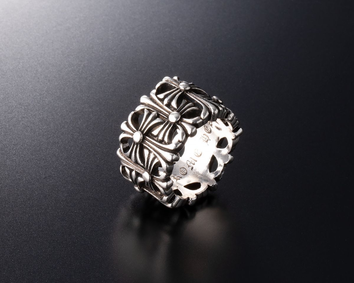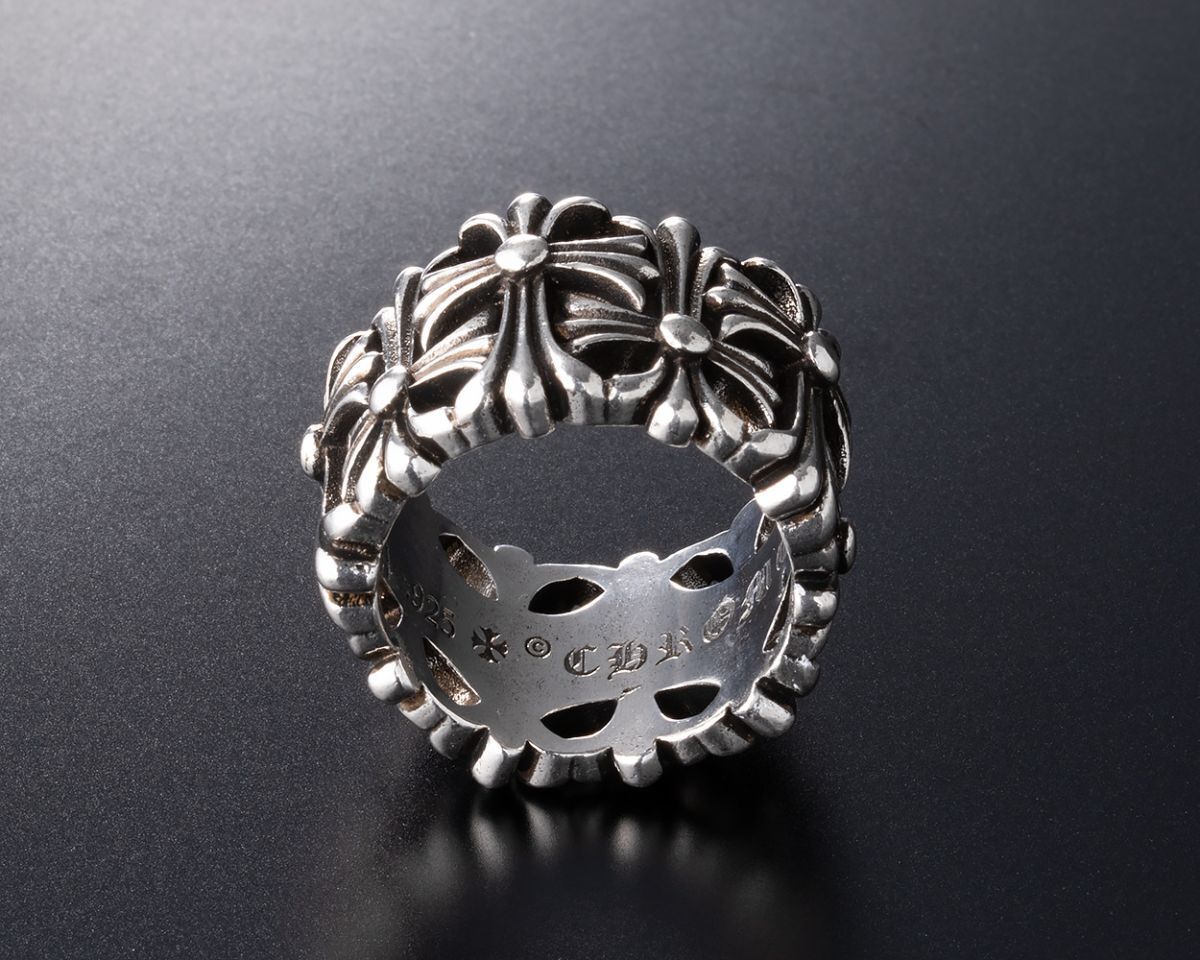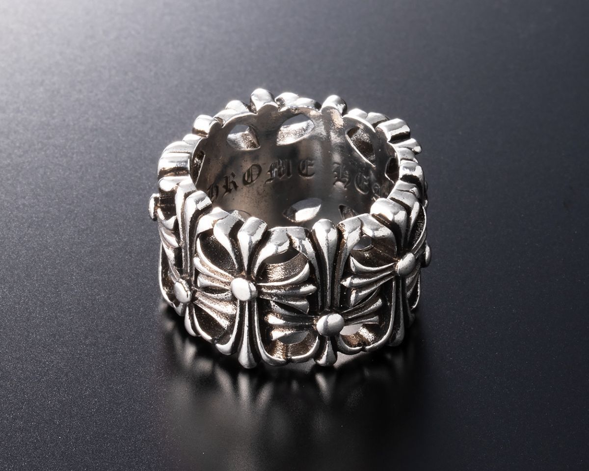 立体的なクロスモチーフが連なり、重厚感あるシルバーが存在感を放つおしゃれなリングとなっています。
