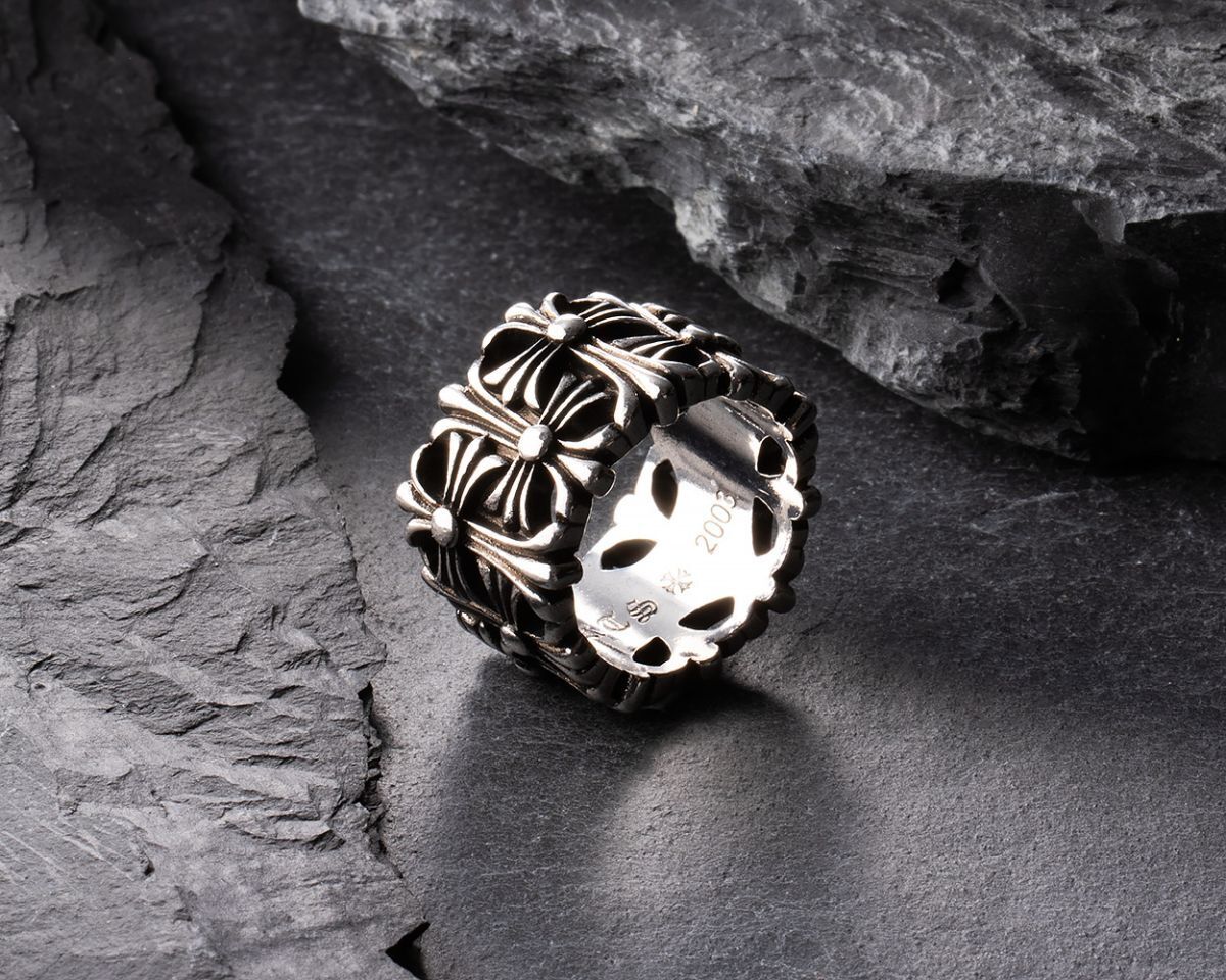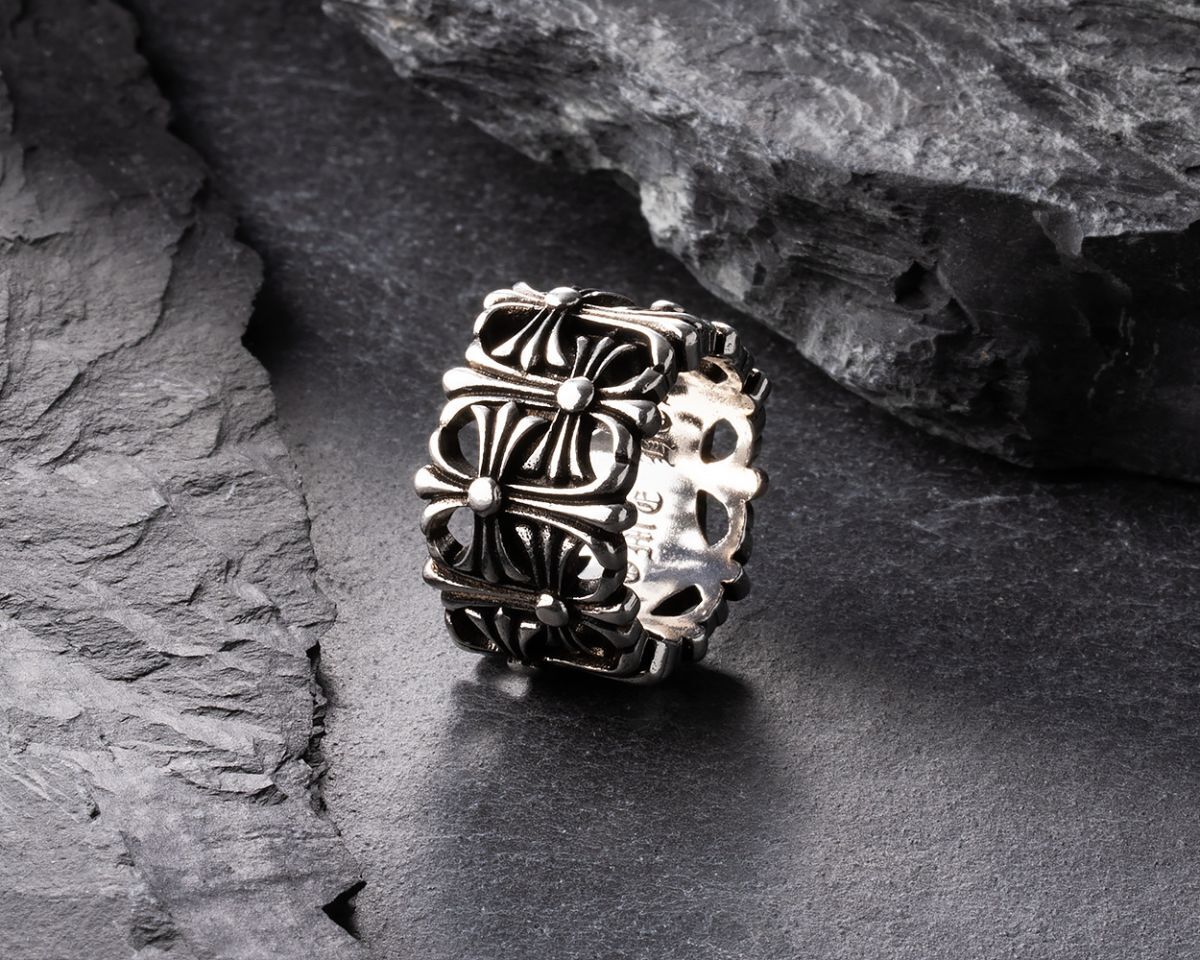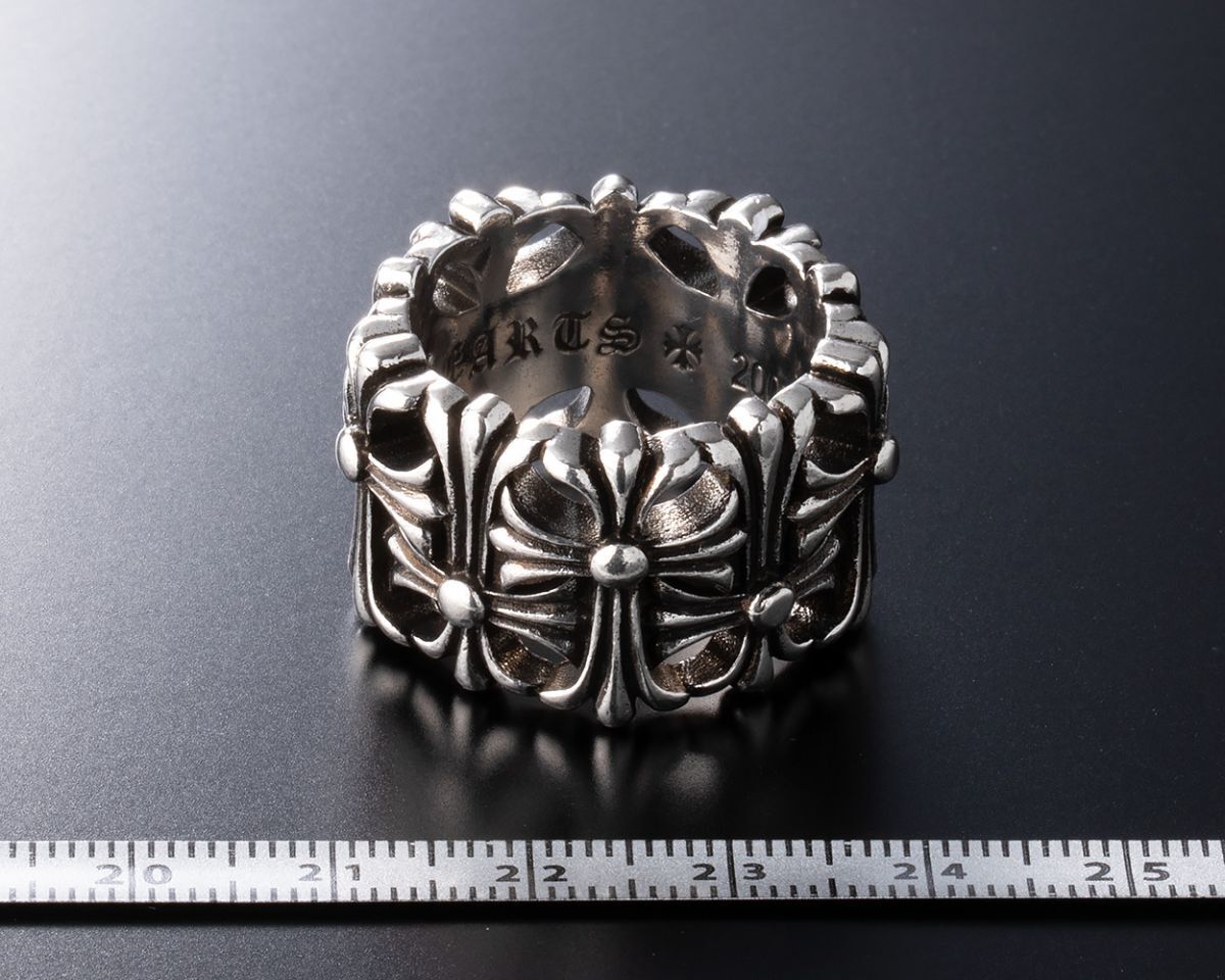 立体的なクロスモチーフが連なり、重厚感あるシルバーが存在感を放つおしゃれなリングとなっています。