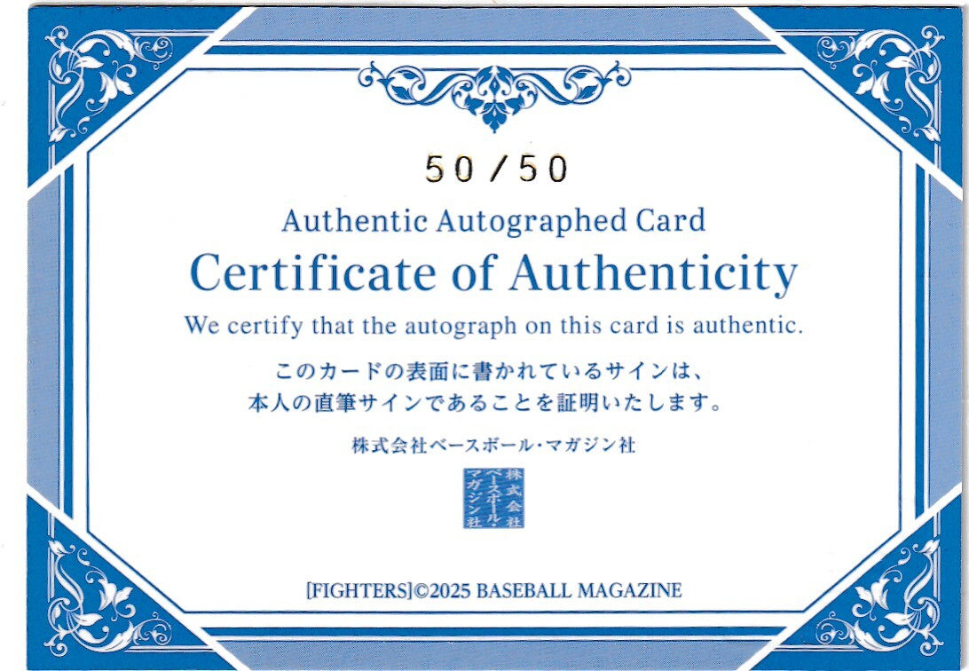 パックから出る直筆サインカードでシリアルナンバーが入っています。シリアルナンバーは50/50のラストナンバーです。画像にはスキャナーの埃や縦線が写っている場合がありますが現物は美品です。