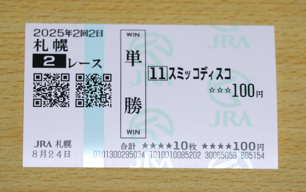 スミッコディスコ 札幌 2R (2025年8/24) 現地単勝馬券(札幌競馬場)です。気に入って頂けた方の落札を心よりお待ちしております。 商品は定型郵便(110円)又は又はゆうパケットポストminiで発送となります。 厚さの関係上、定型郵便の場合は片面段ボール補強、ゆうパケットポストの場合は両面段ボール補強となります。どうかよろしくお願い致します。