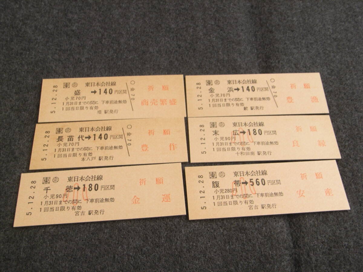 6枚/JR東日本 平成5年 縁起きっぷ?6枚 千徳 長苗代 盛 末広 腹帯 金浜 D型硬券乗車券 6・枚