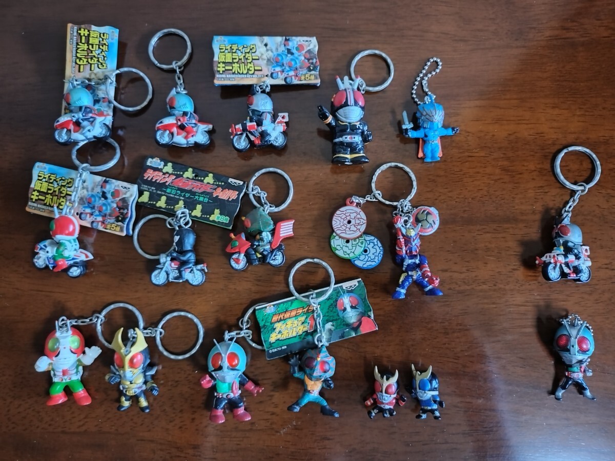 仮面ライダーのキーチェーン13個とマグネットの付いたフィギュア2個のまとめ売りです
