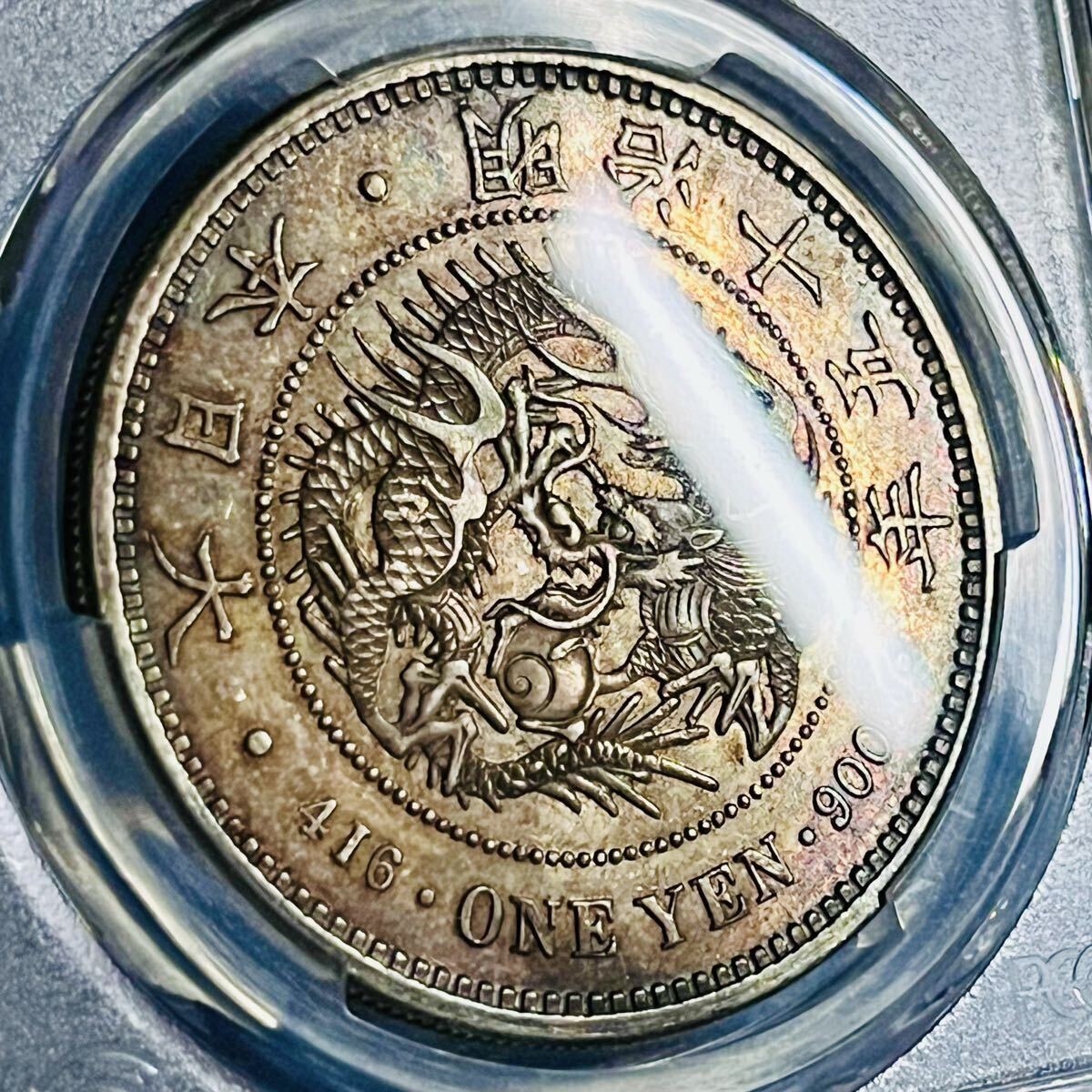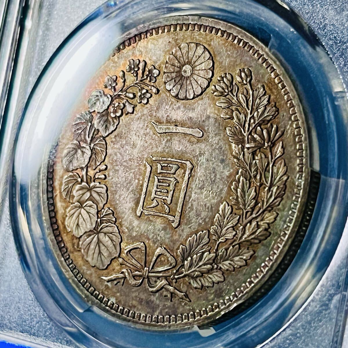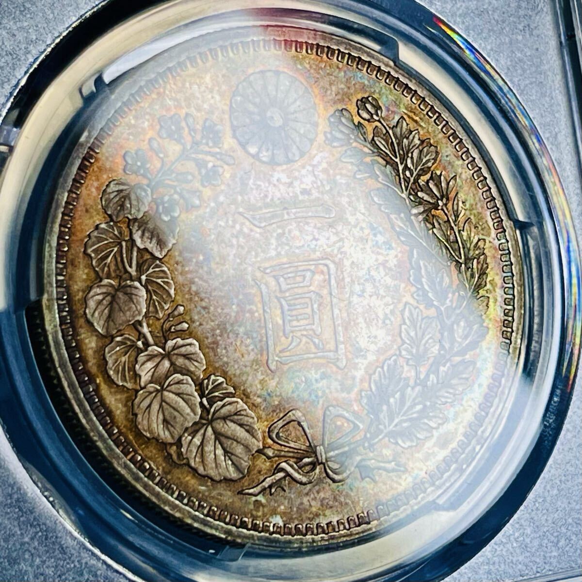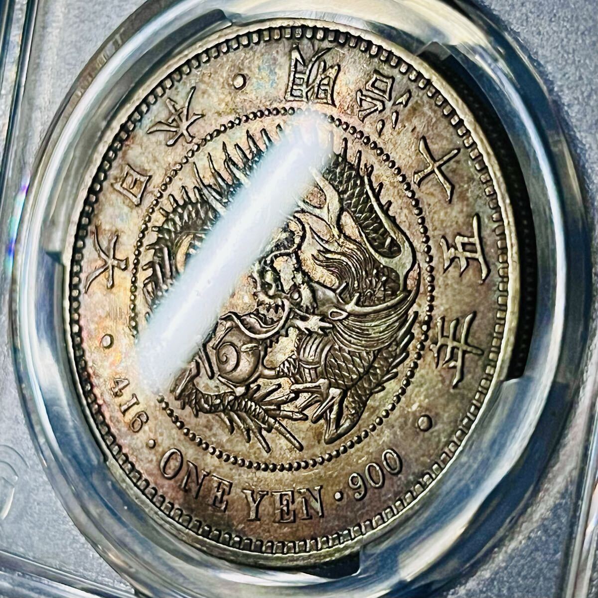 本品はPCGS MS61の未使用グレードで、暁色の金地に紅(マゼンタ)と翠(シアン)が分かれて差し込む、「金暁双彩トーン(きんぎょう・そうさい)」が広がる一点ものです。 38.6mmの大型面で立体感と奥行きが際立ちます。