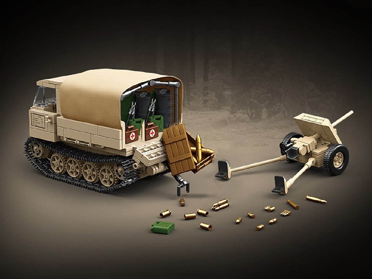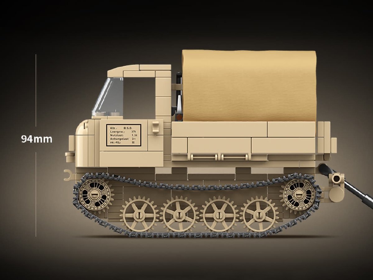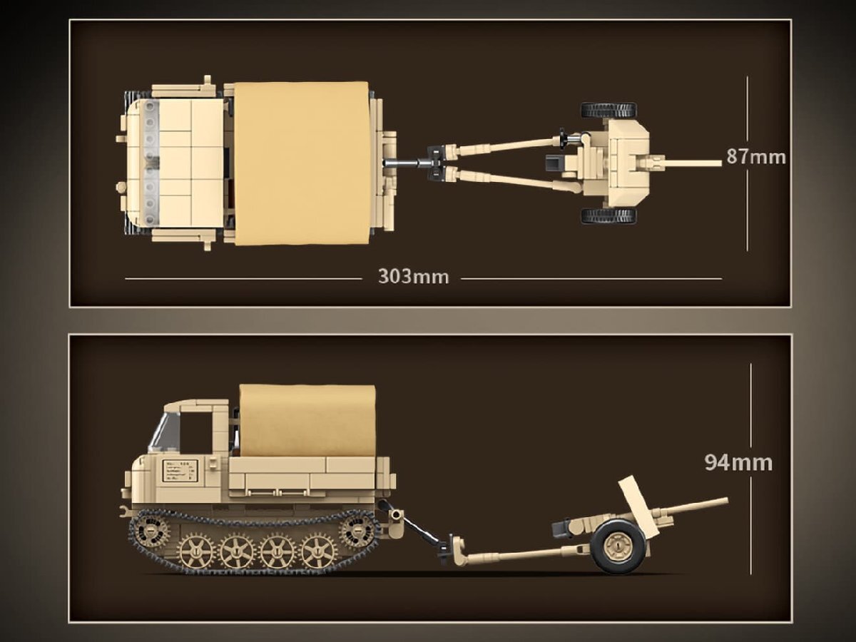 商品説明 ITEM INFO 3.7 cm対戦車砲 PaK 36を実際に連結して遊べるRSOトラクター AFM RSO 装軌式トラクター / 3.7 cm対戦車砲 PaK 35/36 606Blocksです。 楽しく組み立てて、カッコよく飾れるAFM ブロックシリーズです。 RSOトラクターと連結して遊べる3.7 cm対戦車砲 PaK 36がセットになっています。 RSOトラクター(独: RaupenSchlepper Ost)は第二次世界大戦時、オーストリアがドイツ軍用に物資運搬や砲牽引に用いるために開発した装軌式トラクターです。 当時ドイツ軍がソビエト連邦に進行した際、泥沼や悪天候により馬車や装輪式トラックでの前線への補給に重大な支障をきたしていました。この経験から新型牽引・補給用車輌の開発が計画され「量産性に優れた車輌」としてRSOトラクターが提案されました。 幅の広いキャタピラを持ち、泥沼や雪上でも走りぬけ、低速ではあるが悪路の中でも確実に物資を届けることが出来たといいます。生産数も多かったため戦後も残存した車輌があり、それらは民間で土木工事用車輌や雪上車として長く使用されていました。 また、付属する3.7 cm対戦車砲 PaK 36(独: 3,7 cm Panzerabwehrkanone 36)は、当時(第二次世界大戦時)、実際にラインメタル社が設計しドイツ陸軍が使用した対戦車砲です。初期の木製スポーク型転綸の型と併せ、PaK 35/36とも呼ばれています。 そんな3.7 cm対戦車砲 PaK 36と牽引するRSOトラクターがセットになってブロックで登場。 606個のブロックで構成されたキットはほどよい組ごたえでブロックビギナーやお子様でも制作しやすいキットになっています。また組立て後のサイズは約140mm×94mm×87mmとなっています。 楽しく作れてインテリアとしてもグッド!ミリタリーマニアやブロック好きな方に是非! 商品基本情報・スペック ITEM SPEC ●商品名 : AFM RSO 装軌式トラクター / 3.7 cm対戦車砲 PaK 35/36 606Blocks ●商品番号 : M0096T ●ブランド : AFM ●パッケージサイズ : 460mm×300mm×60mm ●完成サイズ(連結時) : 約303mm×94mm×87mm ●素材 : ABS ●総ブロック数 : 606 ●対象年齢 : 15歳以上 注意事項 ITEM NOTE ∇商品固有の注意事項 ※小さなブロックが多く含まれています。誤って飲み込まないようにご注意ください。窒息などの危険があります。 ※誤飲の危険がありますので対象年齢を守り、小さなお子様だけでは絶対に遊ばせないでください。 ※当商品はレゴ(LEGO)商品ではございません。 ※弊社取扱商品以外への互換性はありませんのでご了承ください。 ※梱包は製品外箱に透明の緩衝材を巻いた簡易包装です。 ∇ご購入時の留意事項 ※商品はすべて点検してからのお届けになります。商品によってはパッケージの開封等を行う場合もございますことをご了承ください。 ※商品には万全を記しておりますが、万一不備な点がございましたら、お手数ですがお問い合わせフォームにてご連絡頂ますようお願い致します。なお、海外製品につきましては、輸入時についた若干の傷、痛み等が見られる場合がございます。 国内製品のような完全品をお求めの方はご遠慮下さい。 ※商品が適合外であった場合、またはお客様都合による交換・返品・返金は出来ません。よくお確かめの上、ご購入下さい。 ※モニター環境により、実際の商品の色と若干異なる場合がございますのでご了承下さい。 ※他サイトでも同時販売の為売り切れの際はご了承下さい。 ※売り切れの際は早急にご連絡させて頂きます。(当社休業日を除く) 関連商品 RELATED ITEM |