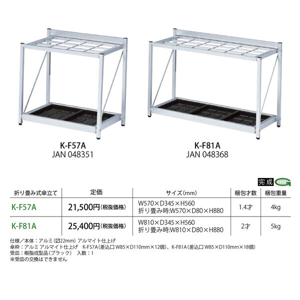 アルミフレームの折畳式の傘立です。 傘を約24本収納できます。 (1口に2本収納した場合) 軽量なので、持ち運びが簡単です。 本商品はグリーン購入法適合商品です。 W570×D345×H560mm 折り畳み時:W570×D80×H8800mm ■生産地:台湾 ■素材・成分:仕様/本体:アルミアルマイト仕上げ 傘枠:アルミアルマイト仕上げ 差込口:W85×D110mm×12個 受皿:樹脂成型品(ブラック) 本商品は『完成品』です。 本商品は『業務用』ですが、家庭用としてもお使いいただけます。お届け日指定 ご注文より4?5日先を目安にご指定下さい。 時間帯指定 「午前」「午後」の時間帯がご指定頂けます。 ※郡部および運送会社の営業所から遠方の場合は、 時間帯指定を承ることができません。 ************ 大型家具の場合 配送先地域によっては発送後8~10日ほどかかる場合があります ************ |