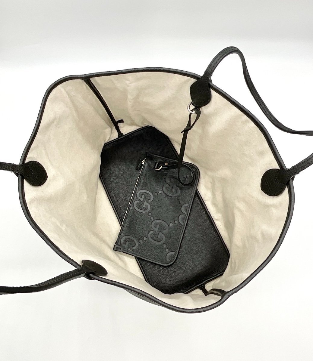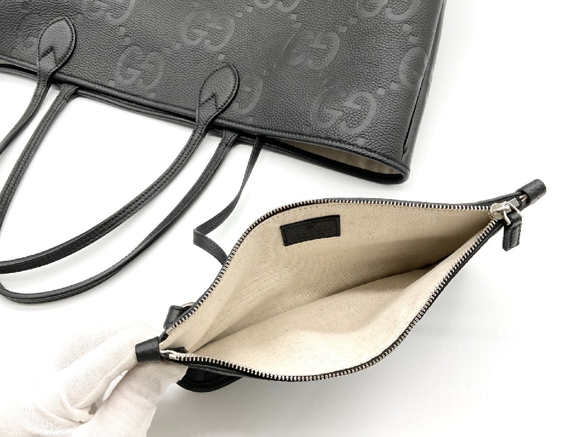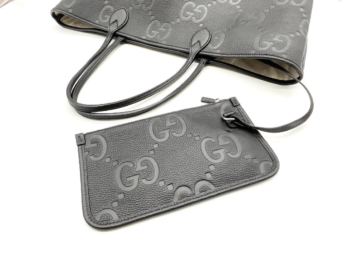【紹介文】:グッチを象徴するジャンボGGパターンを贅沢に施した、23AWコレクションのラージトートバッグ。重厚感漂うデザインと上質なクラフトマンシップが融合し、堂々たる存在感を放ちます。広々とした収納力に加え、実用性に優れたポーチが付属しており、細かなアイテムもスマートに整理可能。洗練されたシルエットが日常を格上げし、グッチのエレガンスを存分に堪能できる、唯一無二の逸品です。