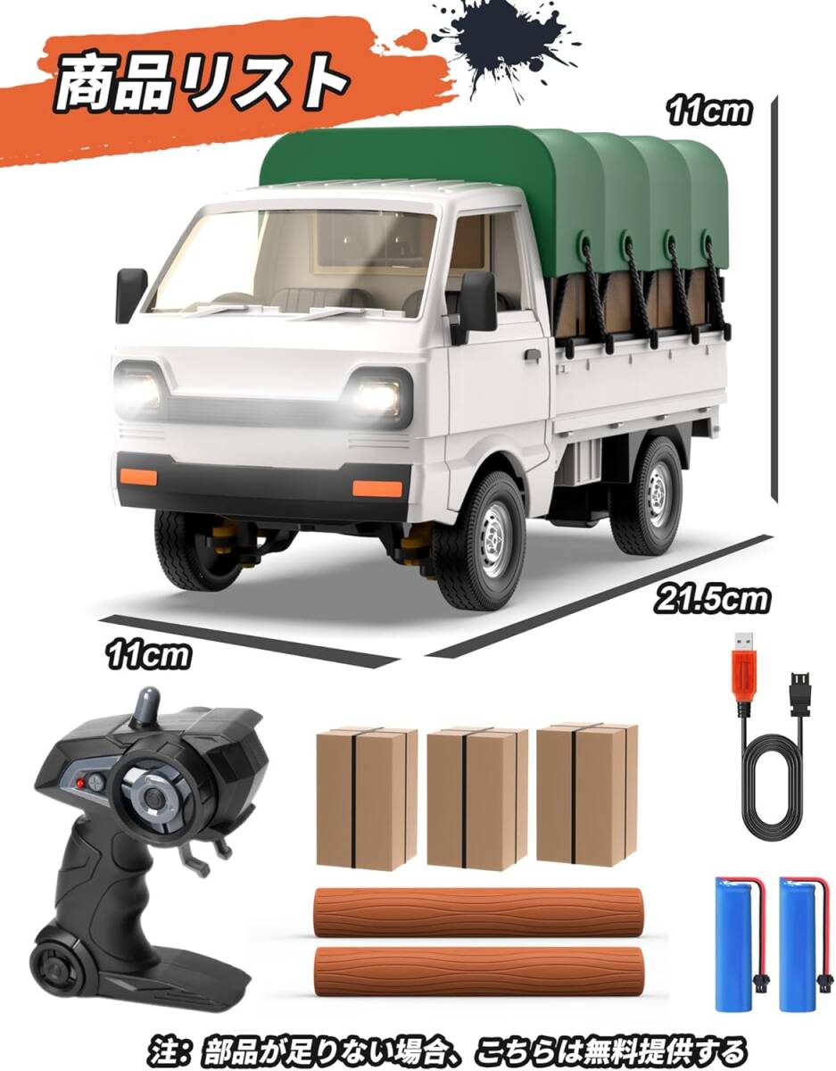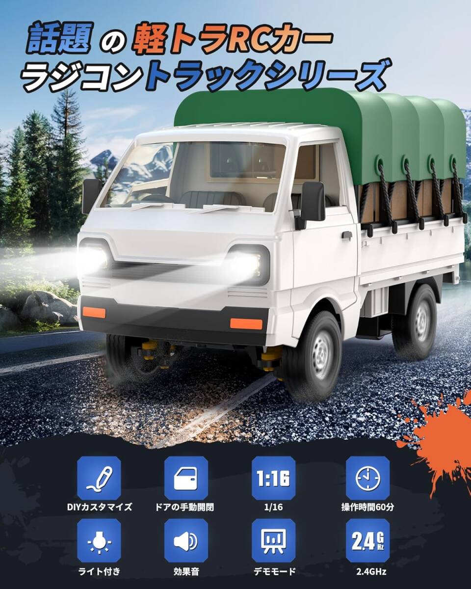 1/16 トラック型 ラジコンカー 軽トラ RCカー 操作時間約60分 LEDライト付き(前後のライトが点灯) 効果音 ドリフト機能 DIY可能 2.4GHz