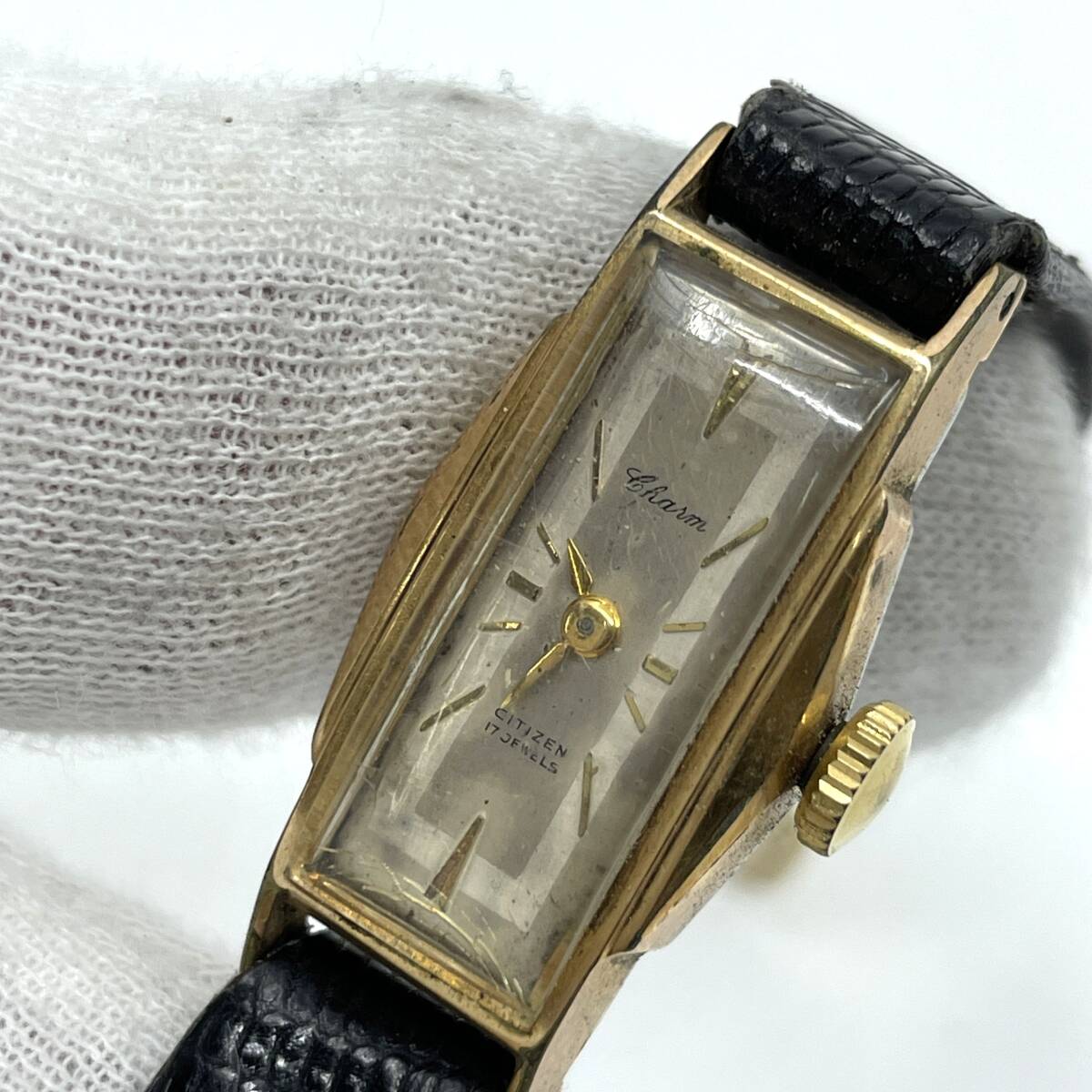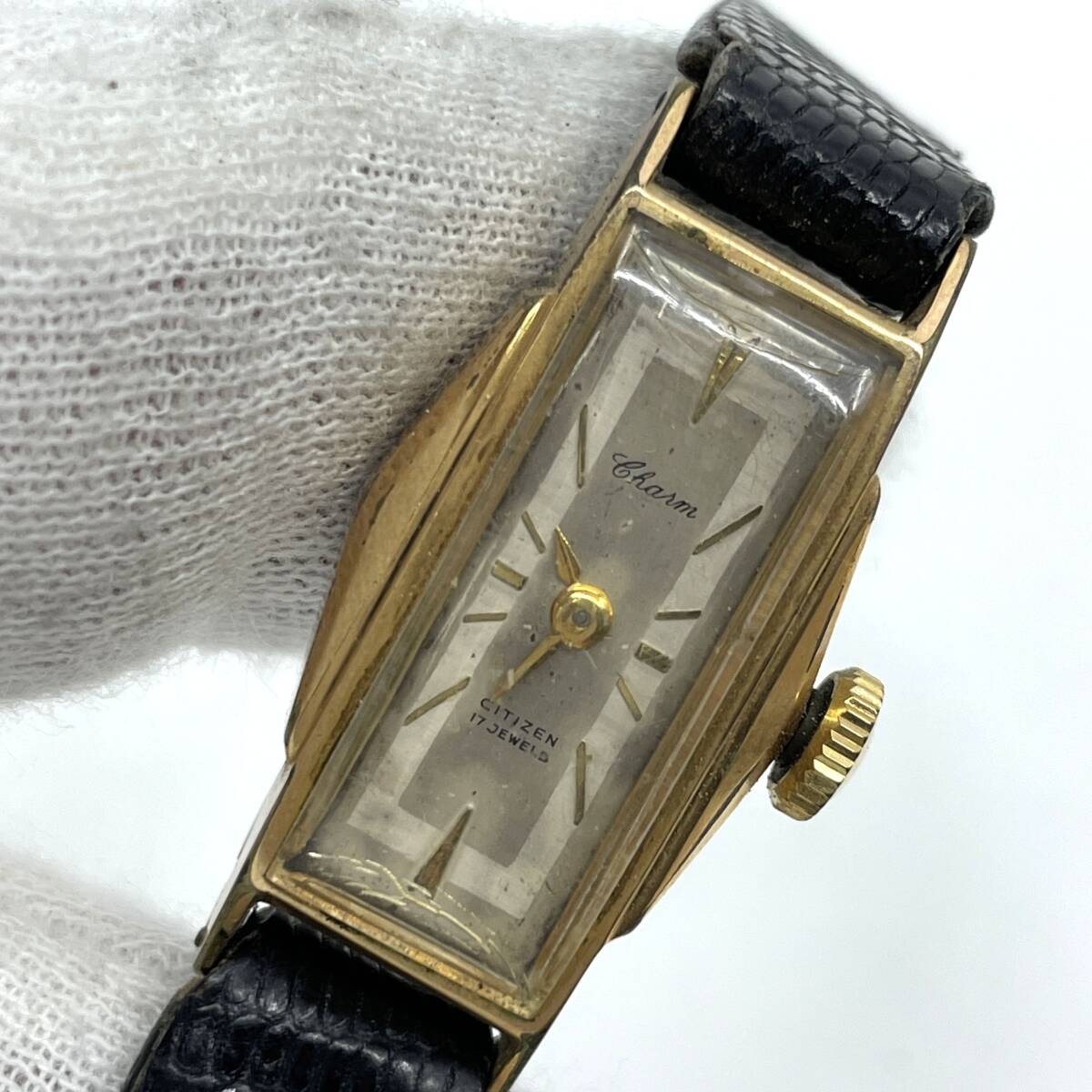 【不動/リューズ巻けず】CITIZEN シチズン Charm チャーム 手巻き 腕時計 シルバー文字盤 2針 17石 レクタンギュラー レザーベルト C5903