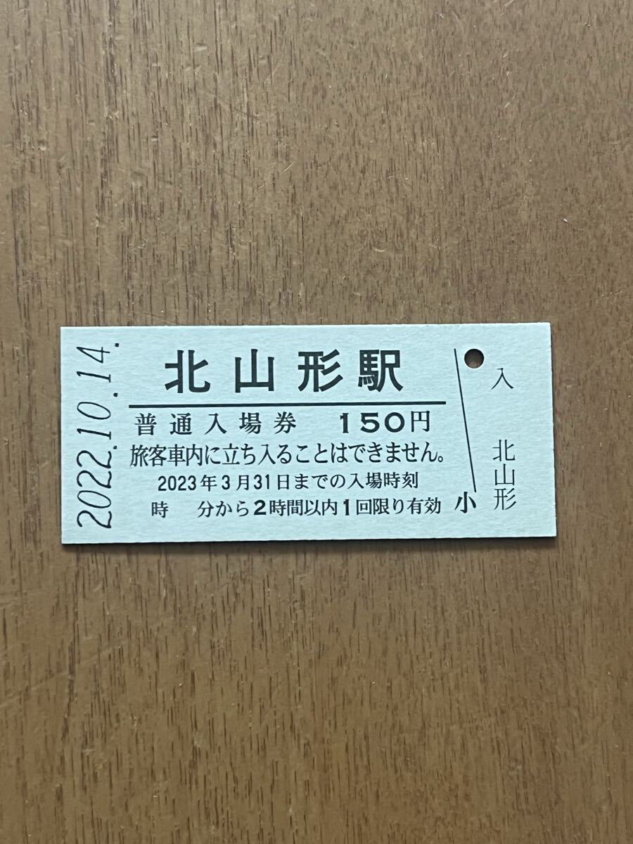 JR東日本奥羽本線北山形駅のB型硬券入場券です。(2022年)