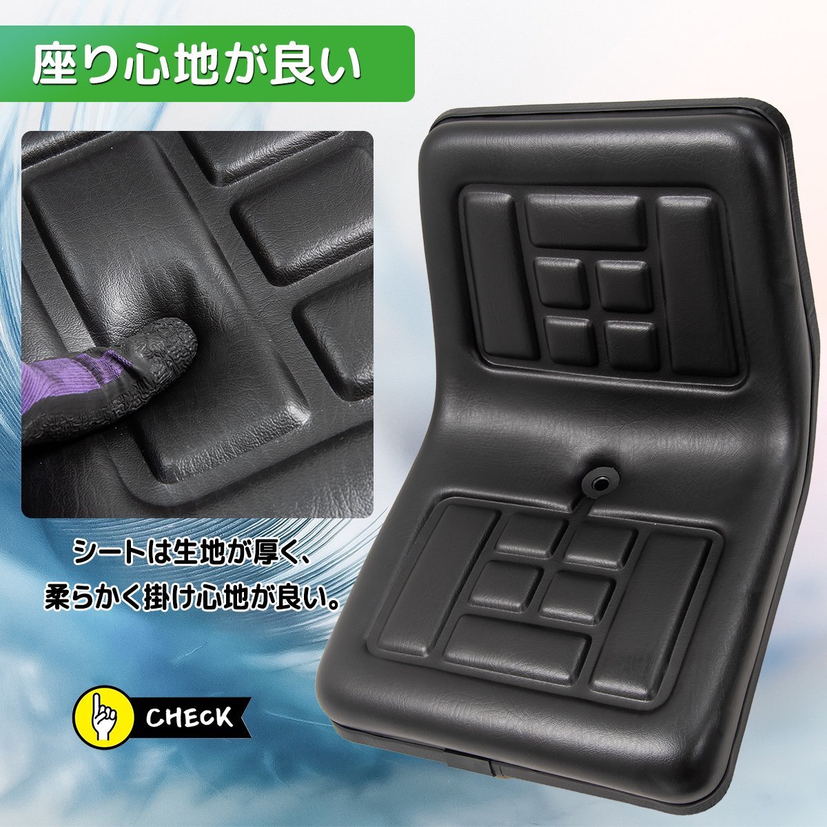 シートは厚手の生地を使用しており、柔らかく座り心地が良い仕様。長時間作業でも疲れにくく、オペレーターの負担を軽減します。