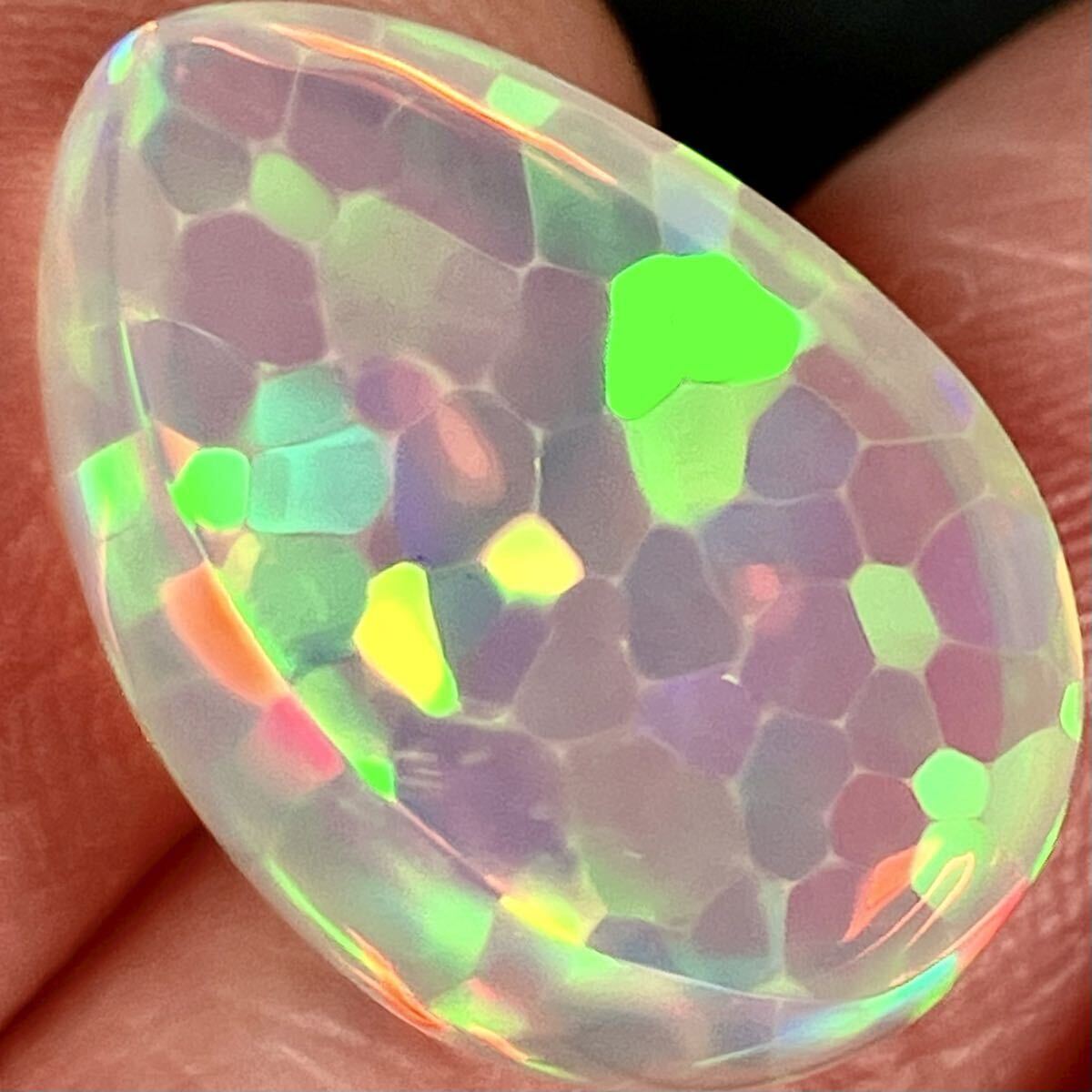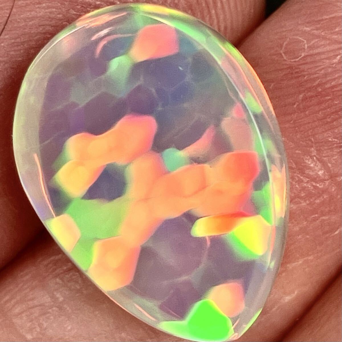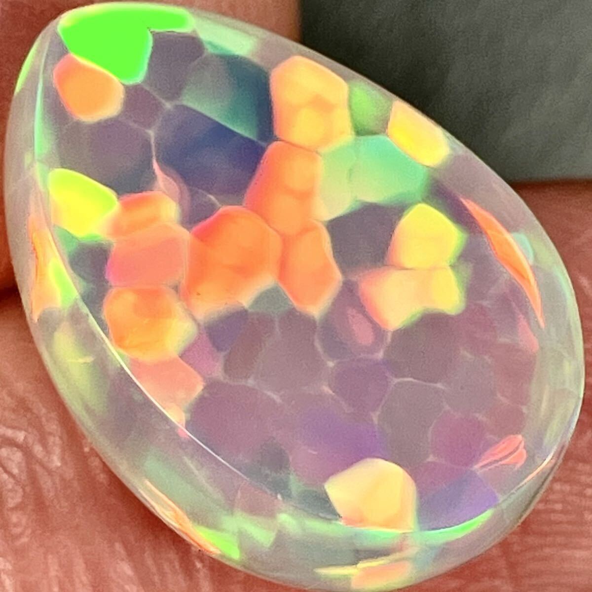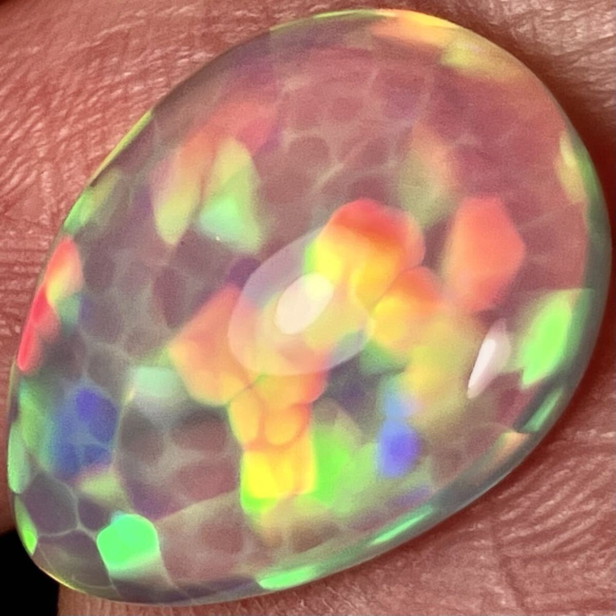 非加熱のノートリートです。こちらのルースは透明なクリスタルに近い半クリスタルのオパールとなっております。また表面はくっきりと美しいハニカムパターンで覆われており、裏面はハニカムパターンとセルが大きく角ばって密集した色斑の、ハニカムの中でも更にレアなモザイクパターンが融合したモザイクハニカムパターンとなっており、大変稀少で珍しいオパールとなっております。画像では本来の遊色の美しさを再現することはできませんので、ぜひ動画をご覧くださいませ。 | ||