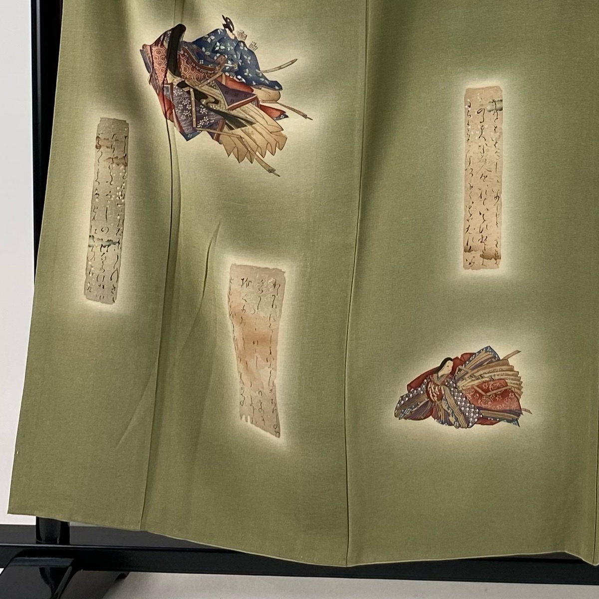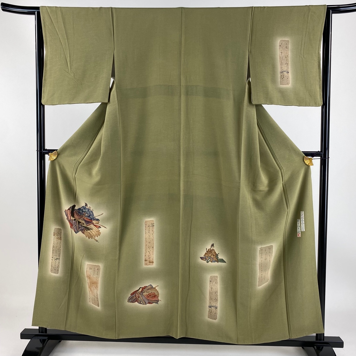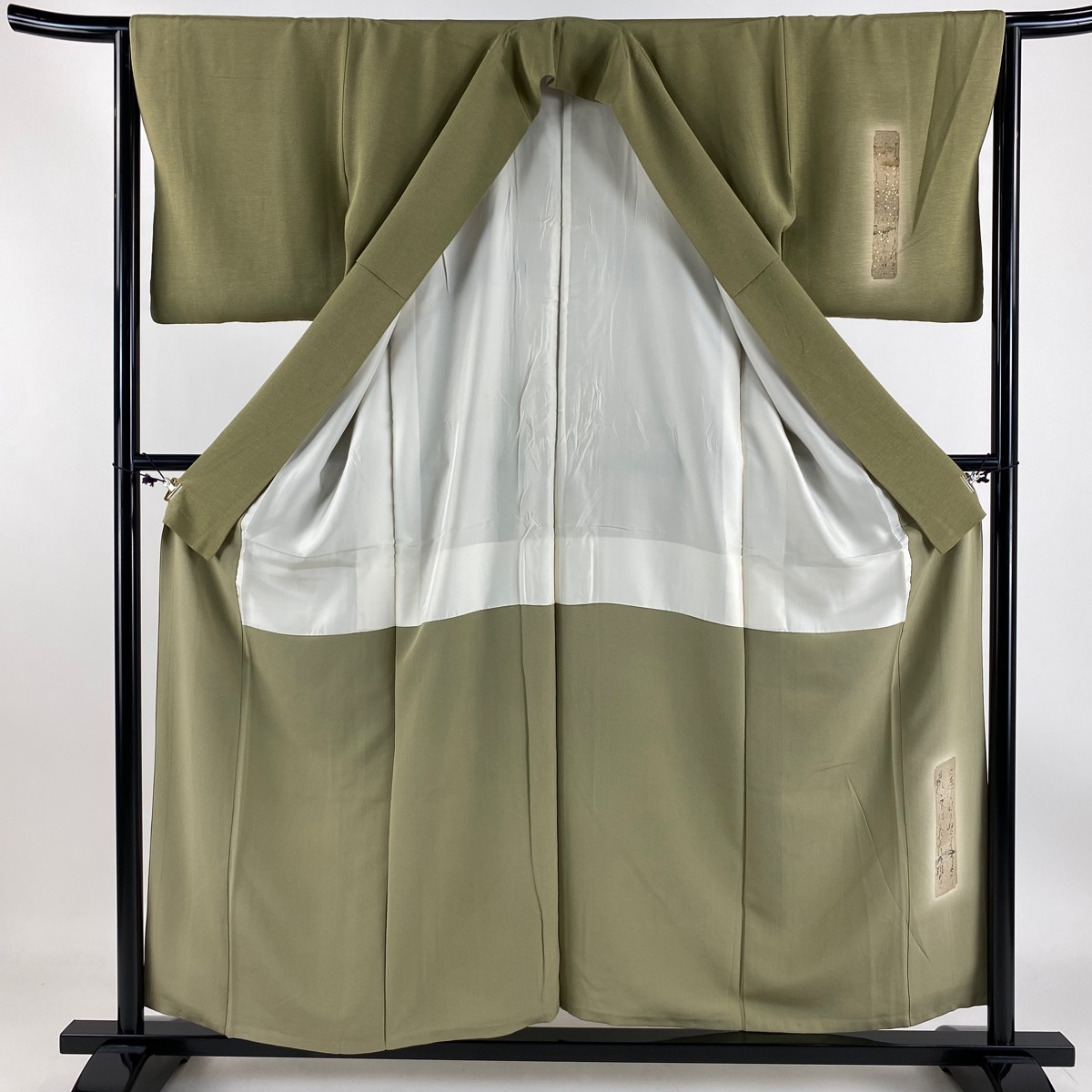 付下げ 秀品 樽本伊勢蔵 落款 人物 文字 金銀彩 ぼかし 鶯色 袷 身丈156 裄丈64.5 M 正絹 【中古】 |