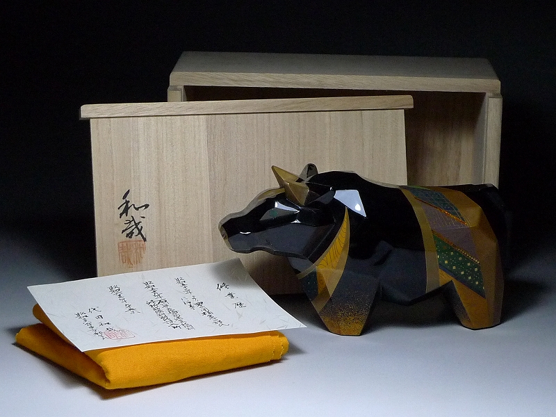 輪島塗 黒塗金彩蒔絵干支置物 丑 代田和哉造 共箱 漆塗り うるし 天然木 うし 牛 縁起物 インテリア
