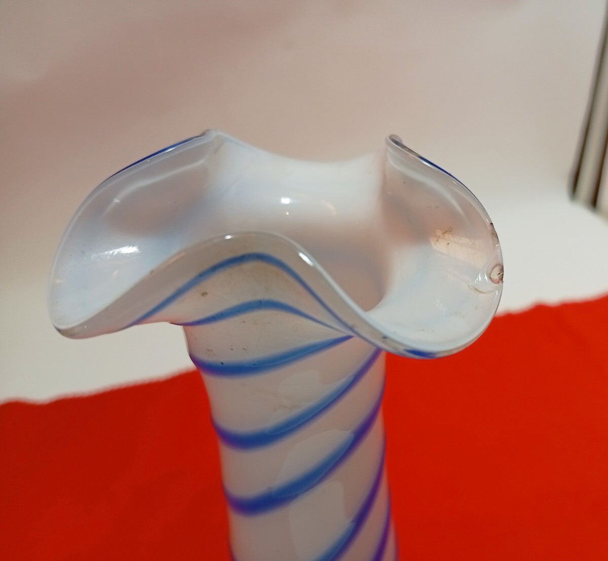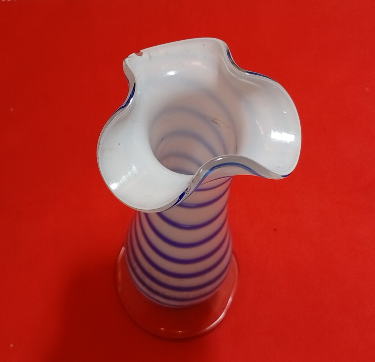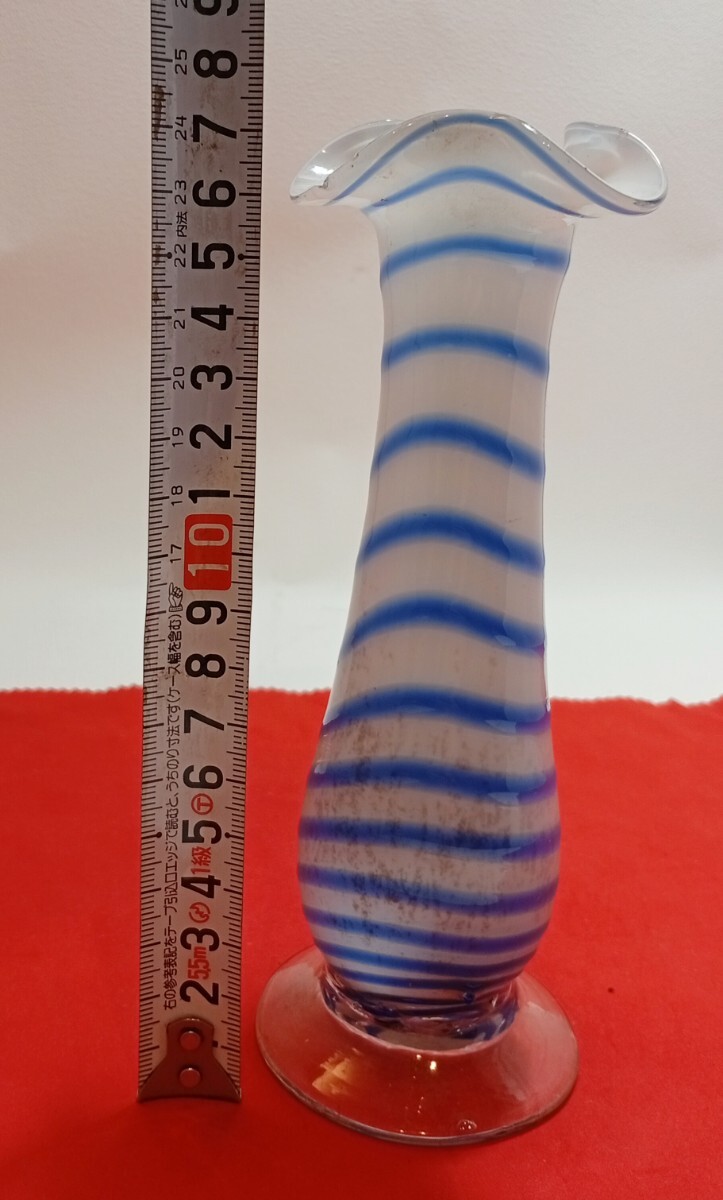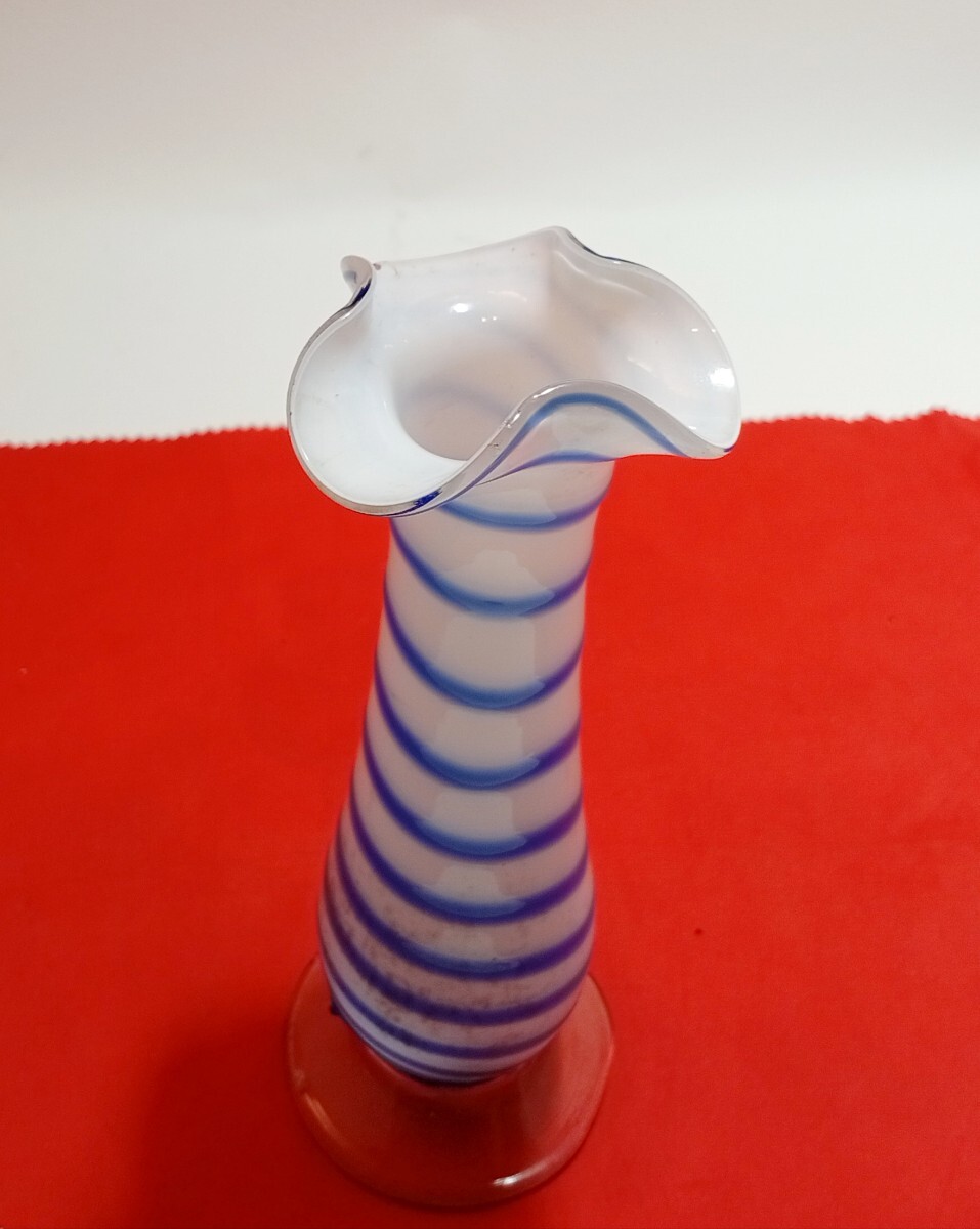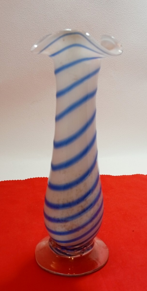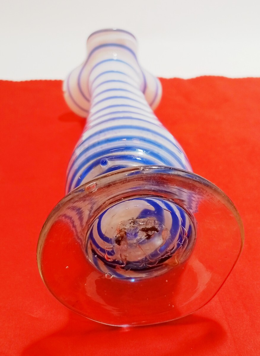 * デザイン: 乳白色のガラスに、鮮やかなブルーのストライプが螺旋状にデザインされています。レトロでありながらもモダンな雰囲気で、どんなお部屋にもしっくりと馴染みます。