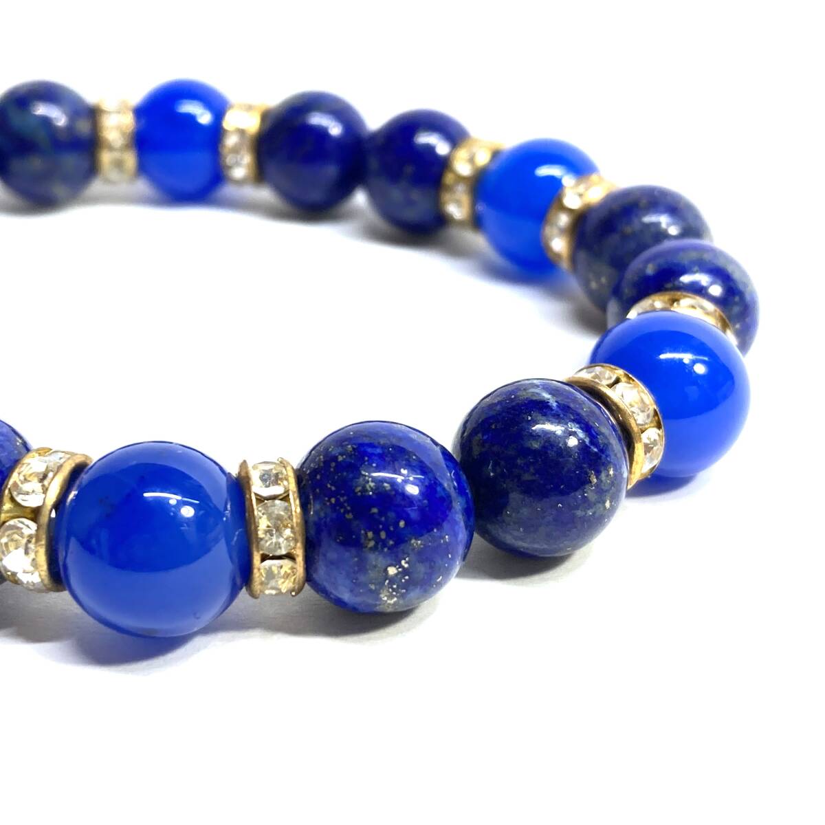 こちらは、ラピスラズリと青瑪瑙を組み合わせたパワーストーンブレスレットです。間にはロンデルを挟み高級感あるデザインに仕上げております。石大きさは腕にも馴染みやすいように10mm玉で内径約18cm(伸可能)です。(サイズ変更の場合は取引ナビにてご連絡をお願いします。) 数に限りがございますので気になる方はお早めにどうぞ。