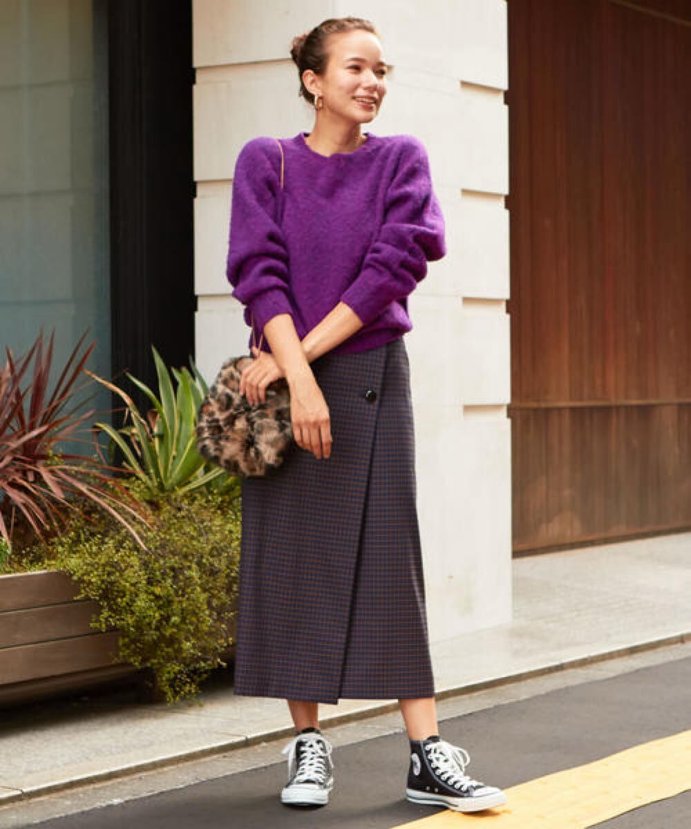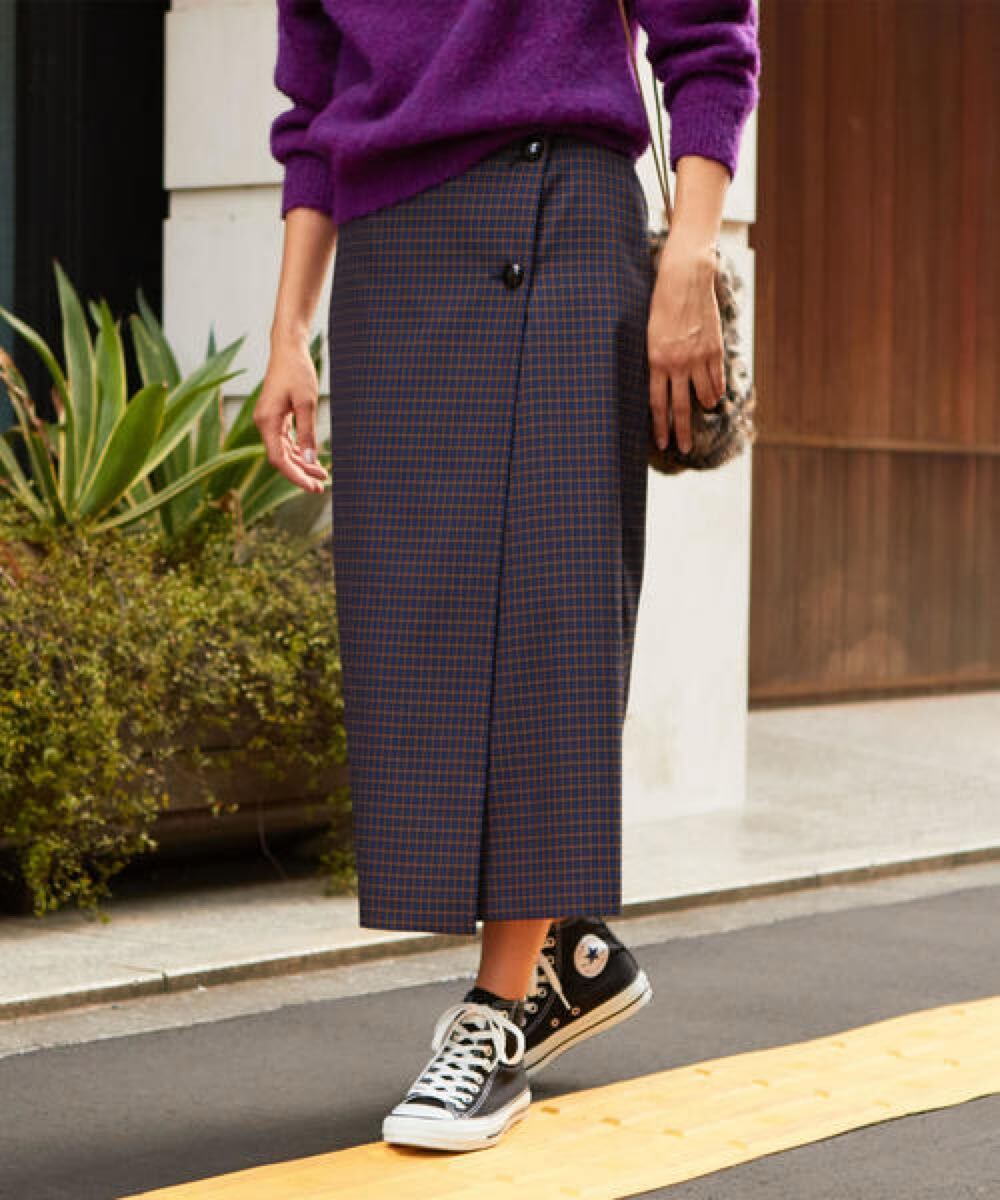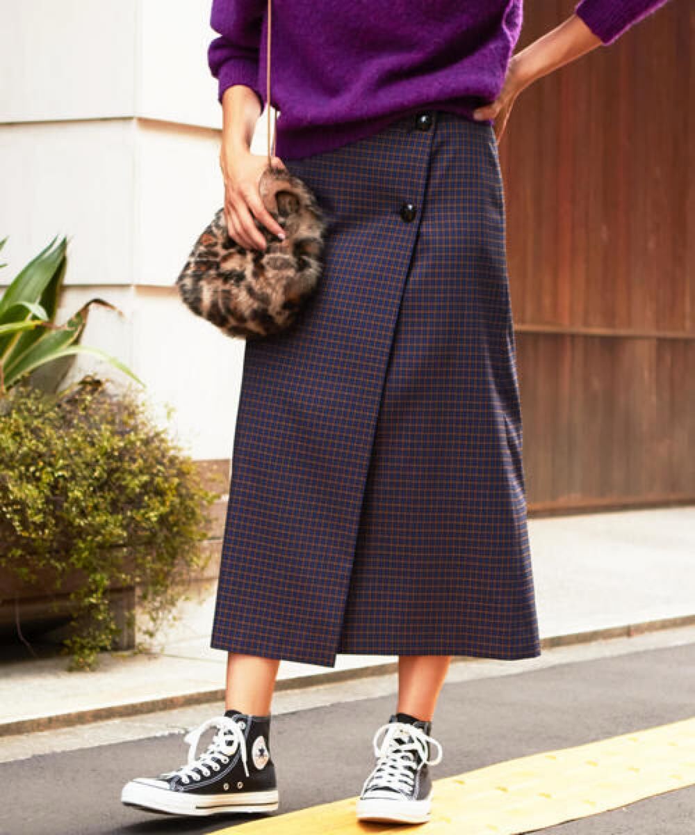 コーディネートが華やぐチェック柄ラップスカート。前下がりのアシンメトリーなデザインに、2つボタンがアクセントになった愛らしい一枚。すっきりとしたウエスト周りは、トップスインもスマートに映えます。カジュアルなスニーカーから、上品なショートブーツまで好相性。秋冬コーデを飾る主役ボトムとして是非。