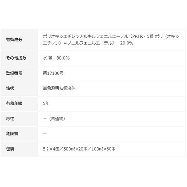 ・有効成分:ポリオキシエチレンアルキルフェニルエーテル〔PRTR・1種 ポリ(オキシエチレン)=ノニルフェニルエーテル〕 20.0%