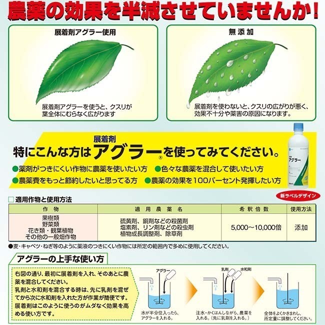 ・ほとんどの農薬に混用でき、展着剤としてすぐれた効果があります。