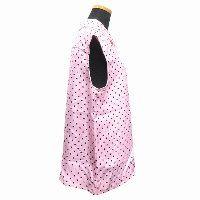 極美品 24SS シャネル CHANEL シルク ツイル ココマーク ロゴ ドット ノースリーブ シャツ ブラウス カットソー ロゴボタン P76701V68667