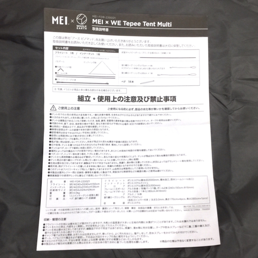 MEI CAMP WHOLE EARTH Tepee Tent Multi MEI-FDR-220021 ティピーテント 1人用 収納袋付き キャンプ用品 現状品 |