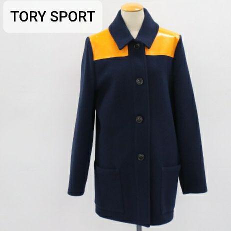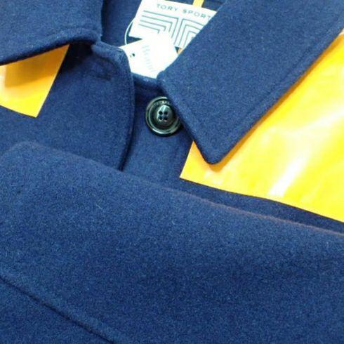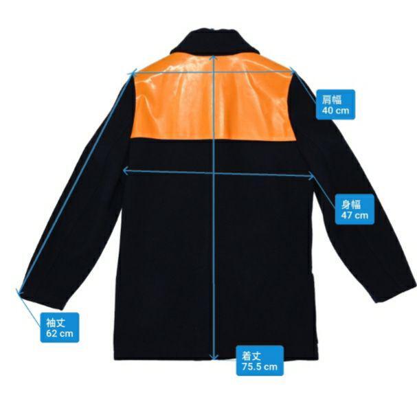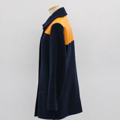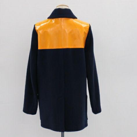 ネイビーとオレンジのコントラストが魅力のトレンチコート。ウールと合成皮革の組み合わせで、スタイリッシュかつ機能的。