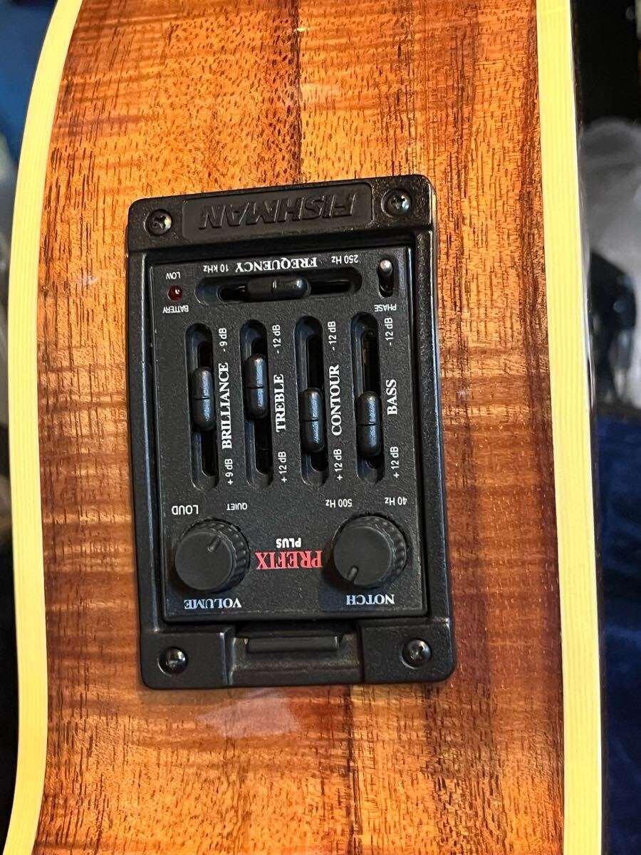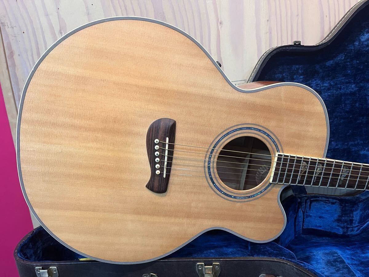 このギターは、タコマの中でもフラッグシップに位置付けられる上位グレードモデルのJK-50CE4 です、ジャンボサイズのボディにピックアップ・プリアンプはFishman Prefix エレクトロニクスを搭載しています。