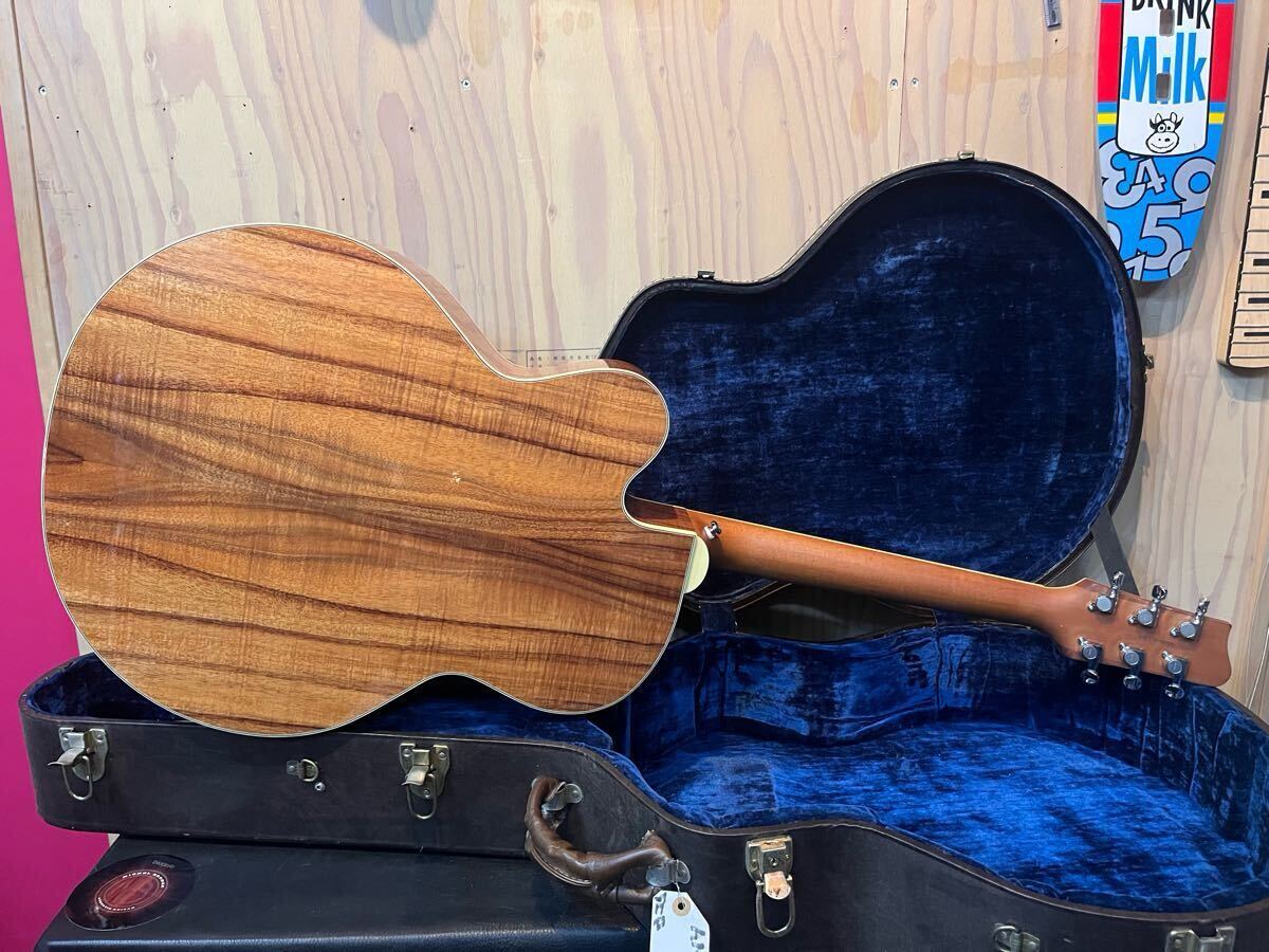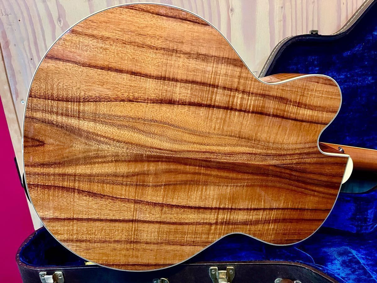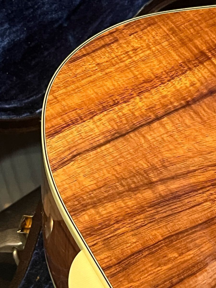 なんと言っても美しいのは、トラ杢目の綺麗に入ったハワイアン・コア材です。サイド、バックともにキルト柄のコア材は美しく、シトカスプルースのトップも目の詰まった最上級のトップ材を使用しています。美しい杢(木目)は、アメリカではカーリー杢とも呼ばれ、ランクとしてはもう今や新材では入手が困難な最上位のAAAランク相当の材です。
