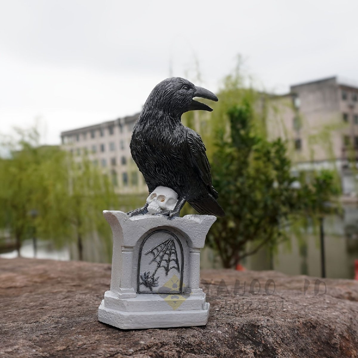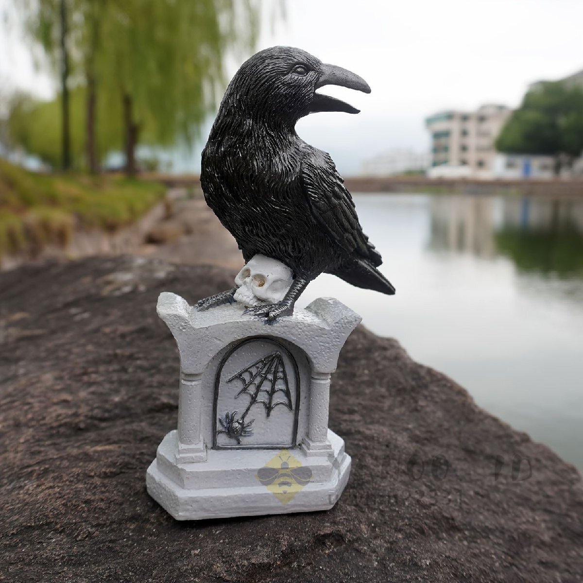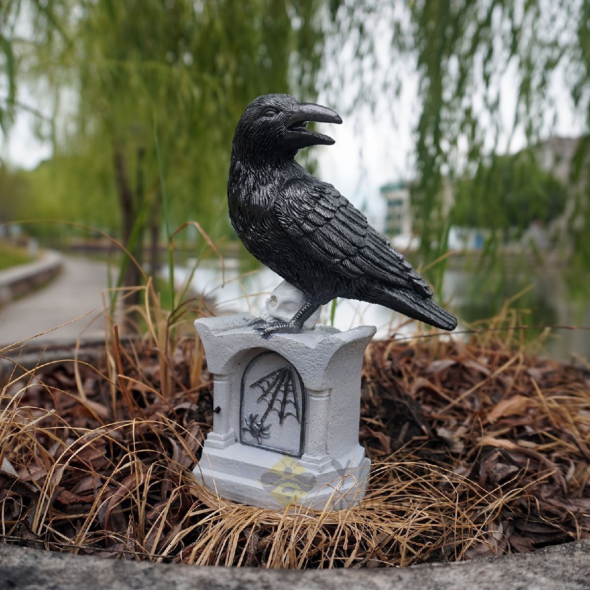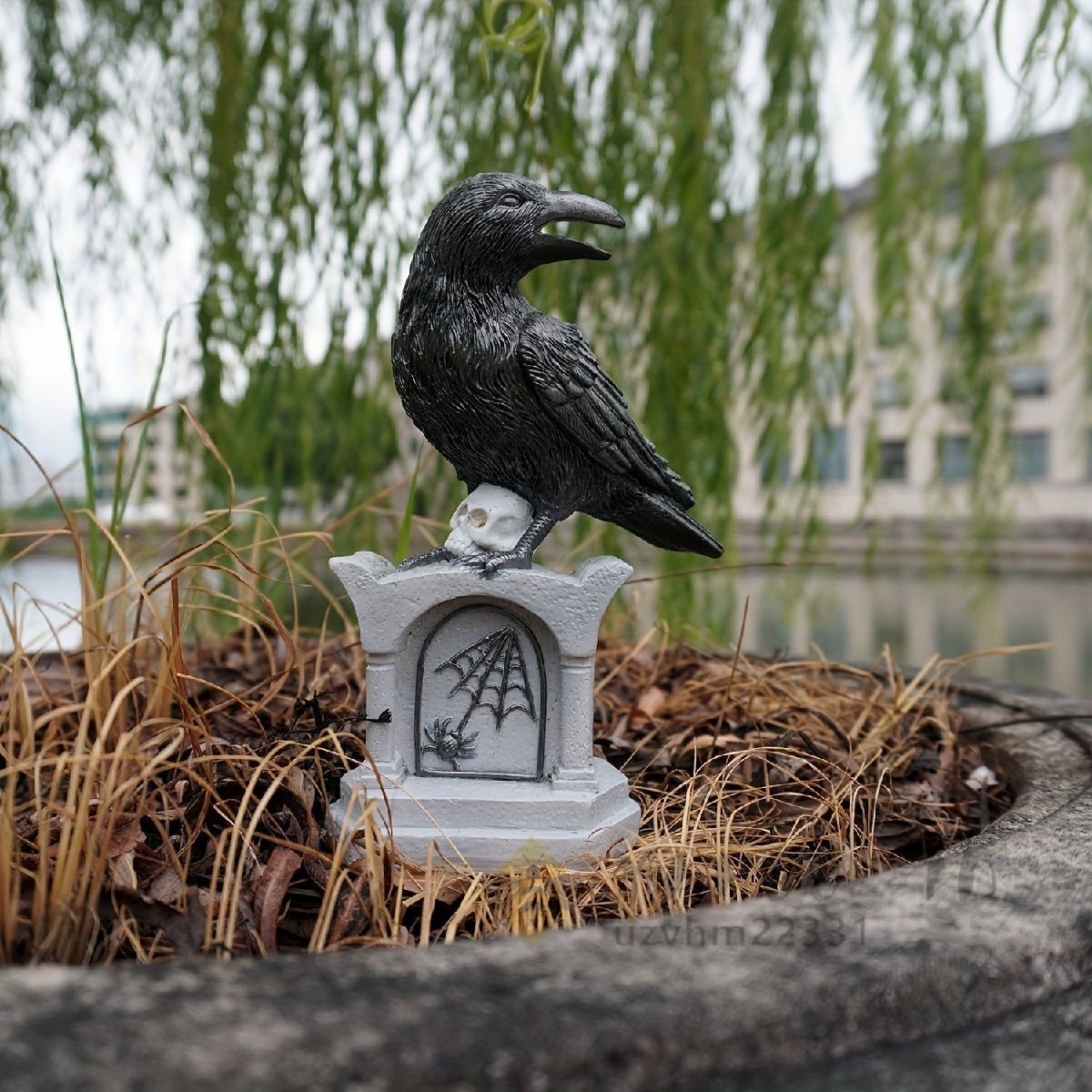 ユニークなガーデンオーナメント、墓の上に乗っているカラスの置物です。玄関やリビング、ダイニングなど、さまざまなインテリアにぴったりのデザインが魅力です。樹脂製のため軽量で耐久性も高く、屋外でも安心してお使いいただけます。ガーデニングの装飾としても最適で、庭を一層引き立てる存在になるでしょう。訪れる人々にインパクトを与え、楽しい空間を演出します。