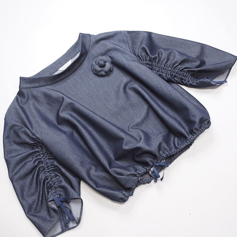 ネイビー シャーリング使い カメリアコサージュ付きブラウス