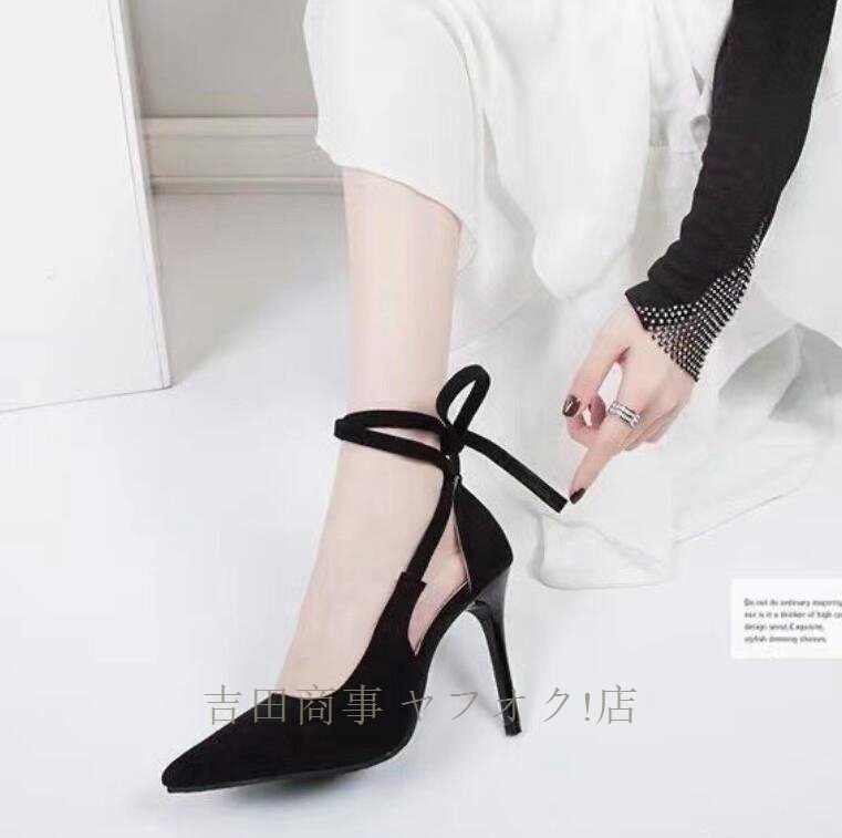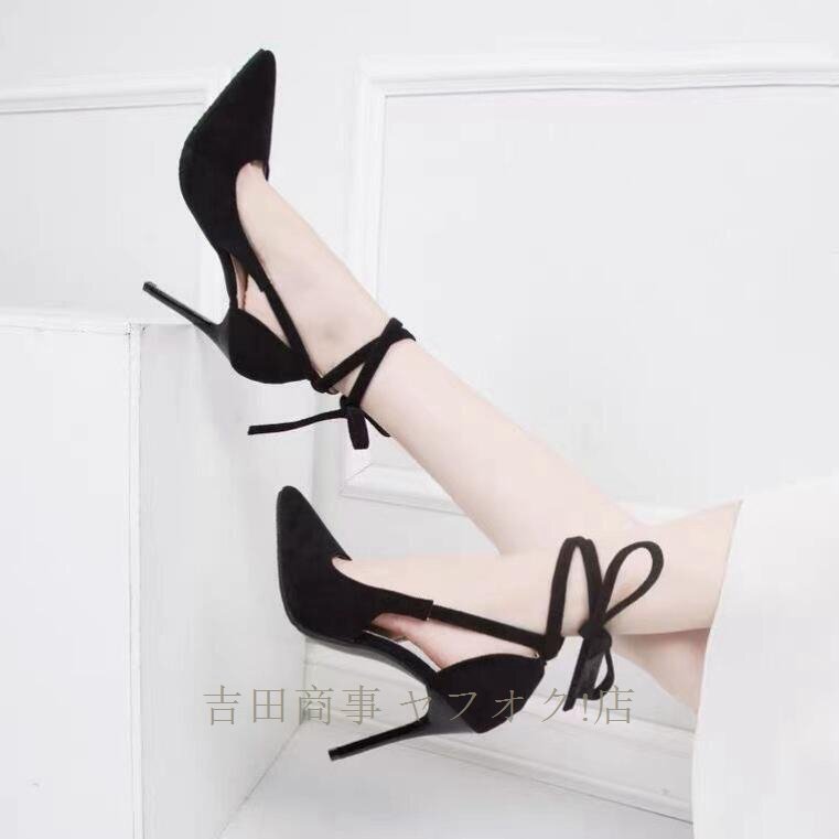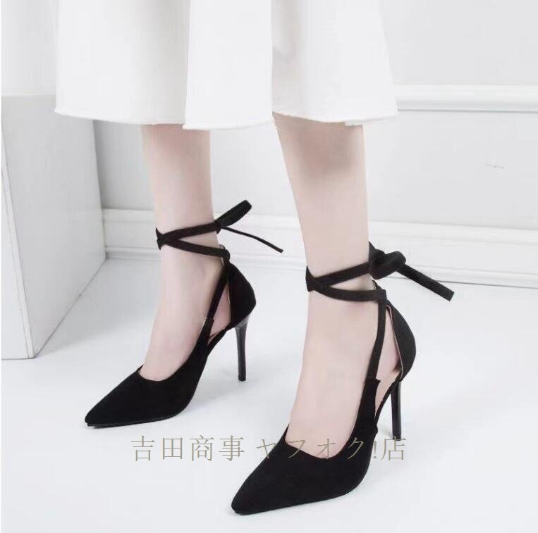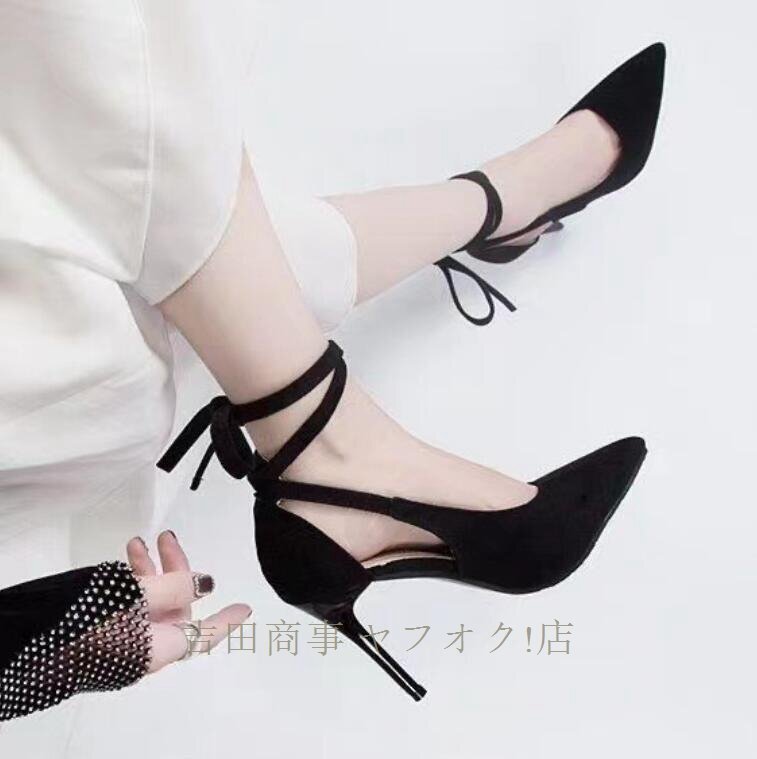 ☆新品 レディース ハイヒール ブラックパンプス サンダル 美脚 インテッド シューズ ピンヒール 結婚式 紐を締める ブラック