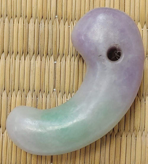 濃淡古代紫色ローカン質の太く丸い三色勾玉です。