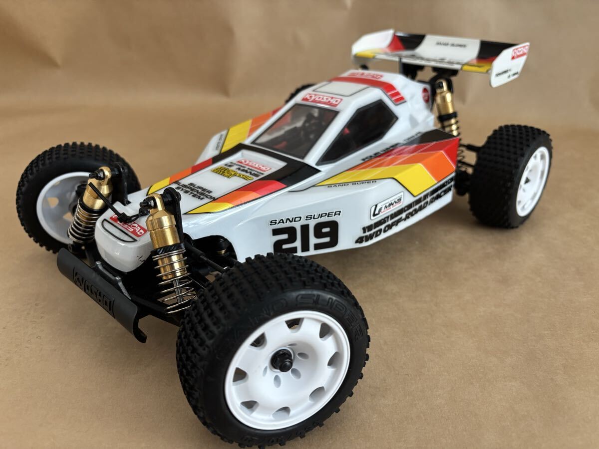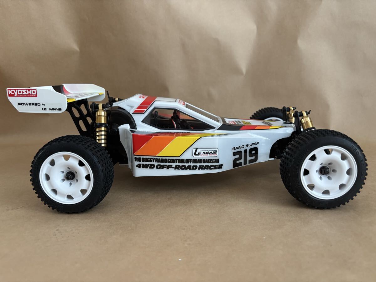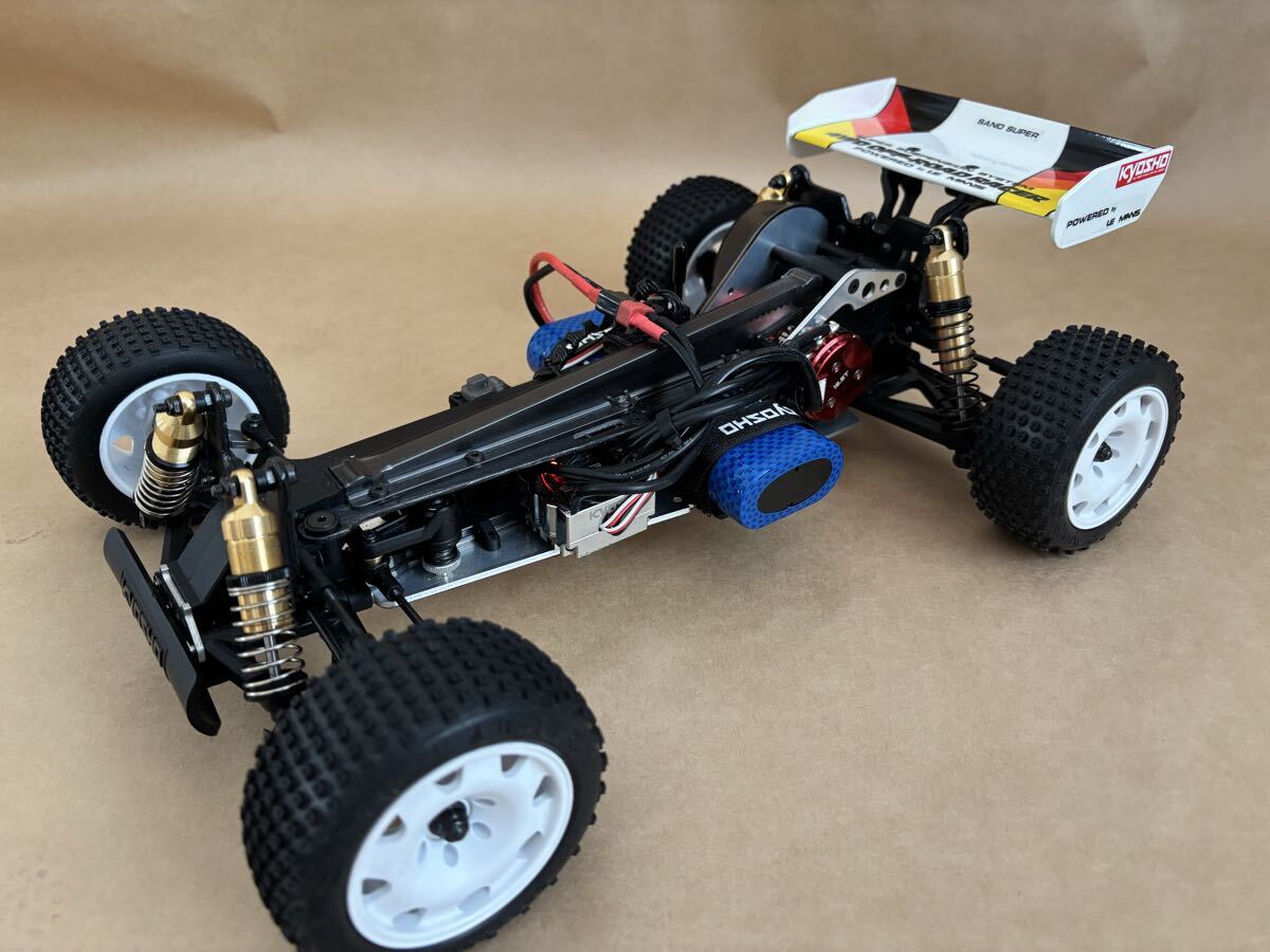 約2年前ショップにて新品で購入し当方(素人)が組み立て塗装、数メートルテスト走行したほぼ新品のメカ付 京商 4WD オフロード ビンテージ バギーオプティマ ミッド です。