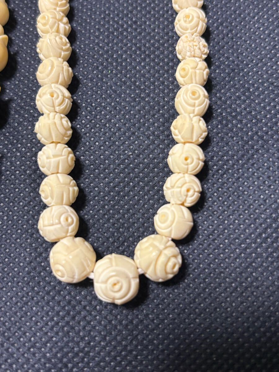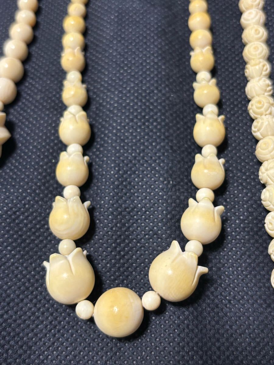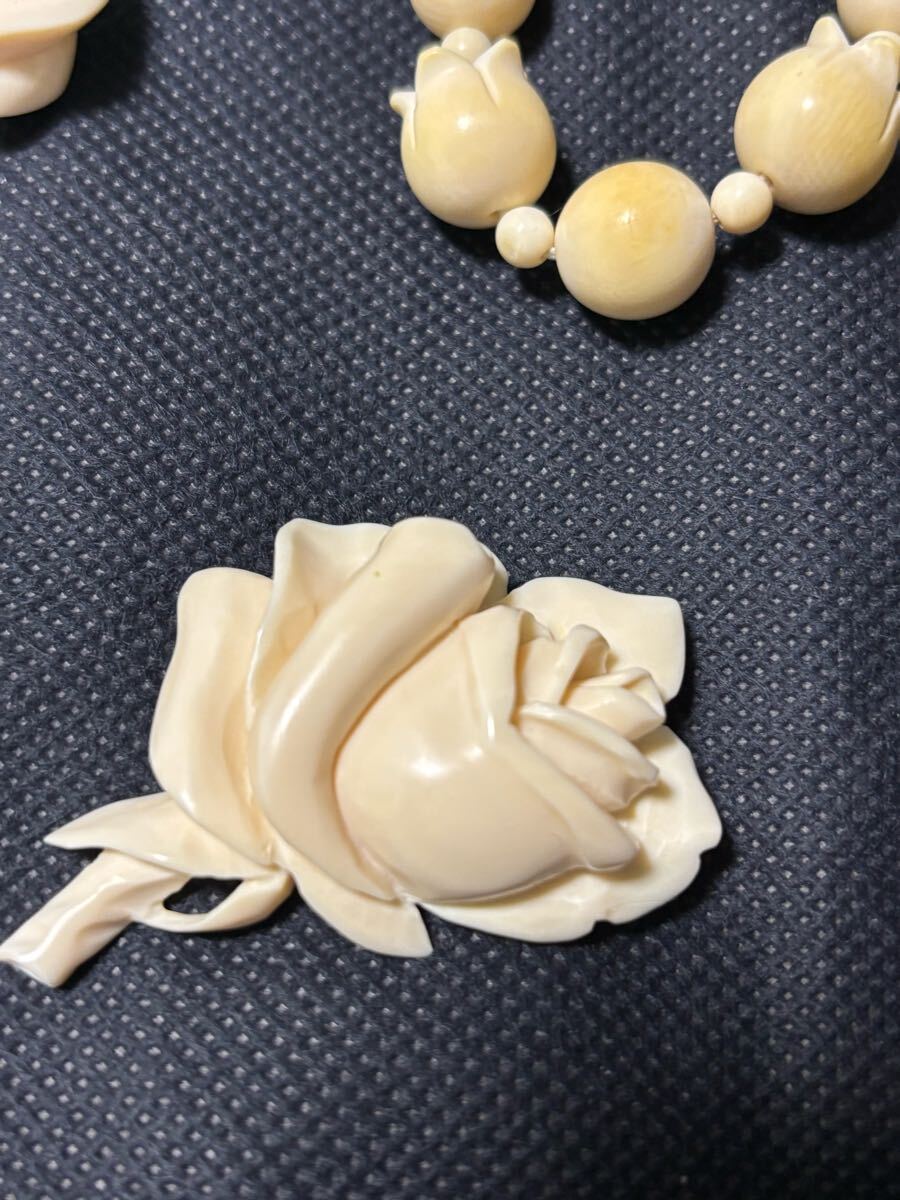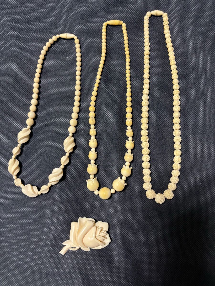 クリーム色の3本のネックレスとバラのブローチのセット。