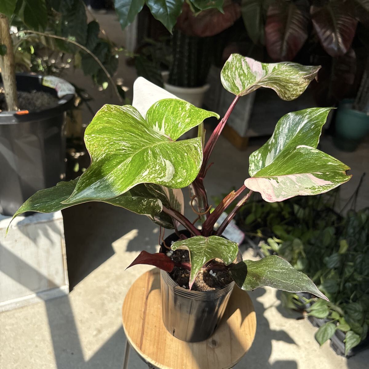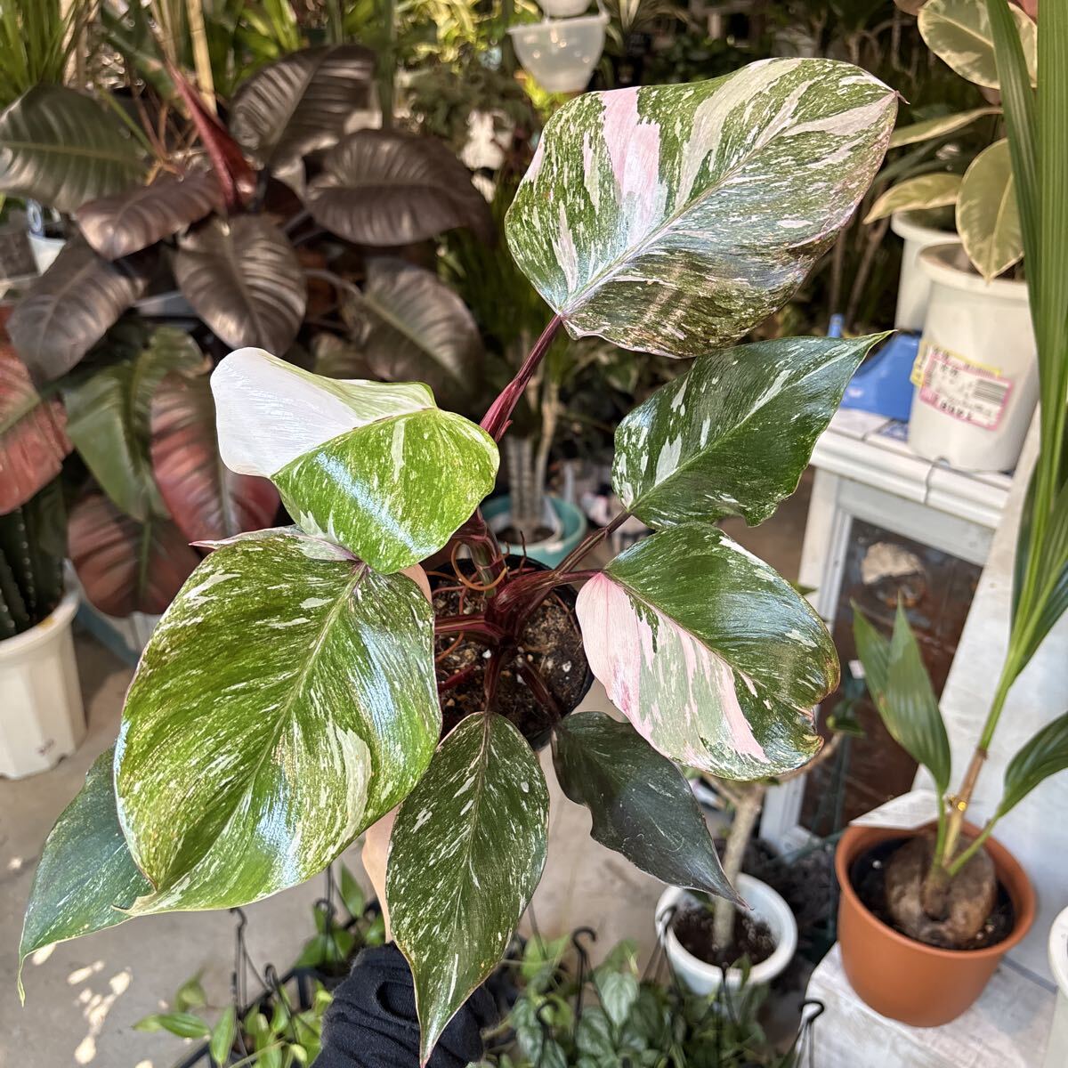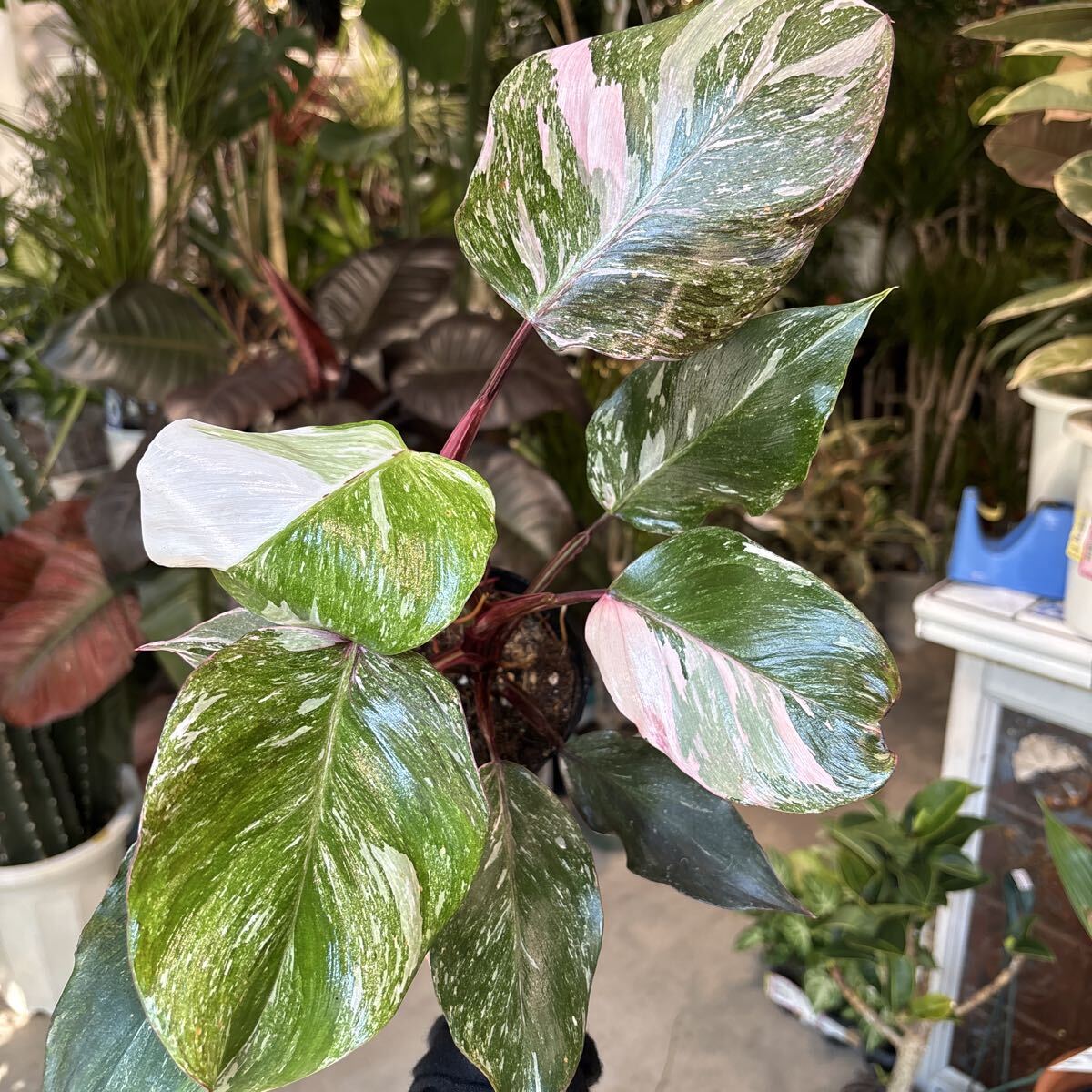 フィロデンドロン マーブルピンクとは、フィロデンドロン属の植物で、紫褐色の葉に淡いピンク色の斑が入り、さらにマーブル状の散り斑が入る、非常に珍しく美しい品種です。宇宙に星を散りばめたような葉の模様が特徴で、「ピンクプリンセスギャラクシー」とも呼ばれ、希少価値の高い観葉植物です。