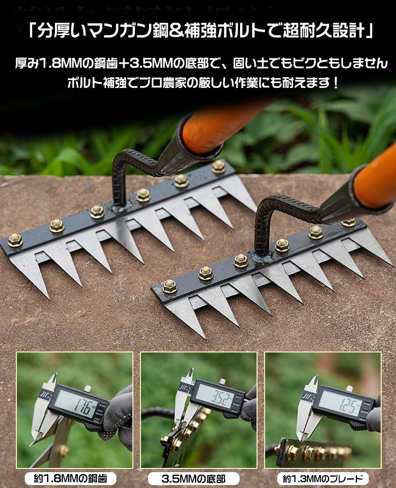 ■【作業効率向上設計】鋭利な歯先が土壌への食い込みを容易にし、作業効率を大幅に向上。耐久性と耐磨耗性に優れ、家庭用から農業用まで幅広く活用できる多機能ツールです。庭仕事を快適にする必須アイテム!