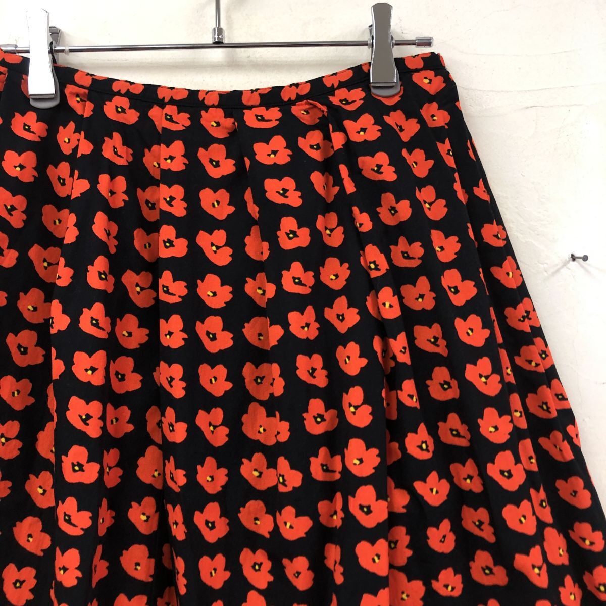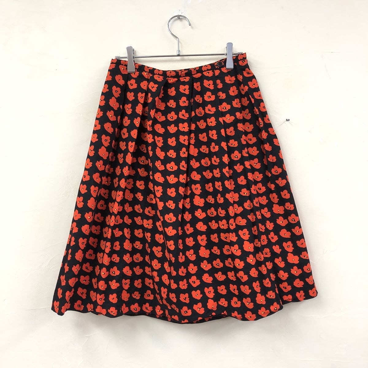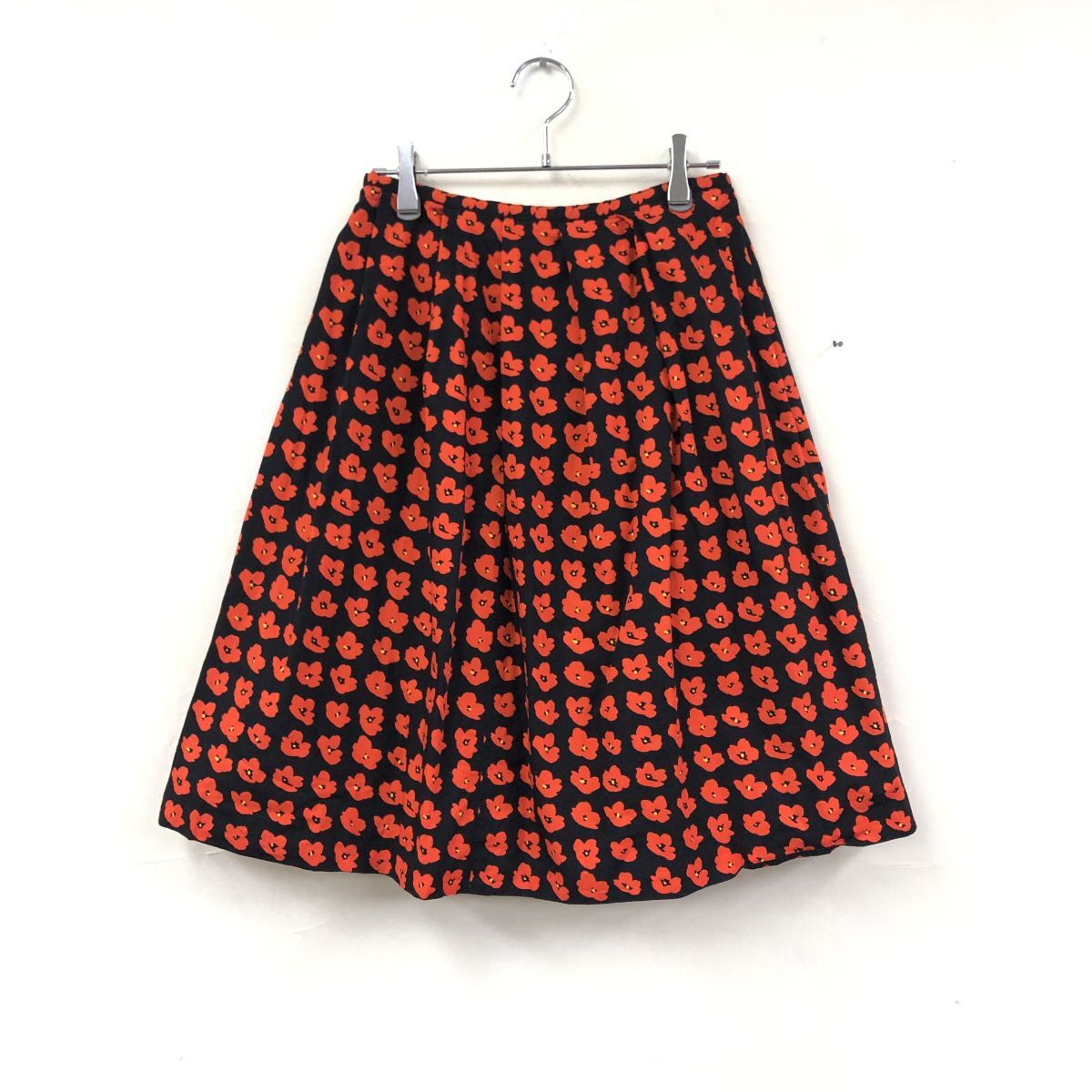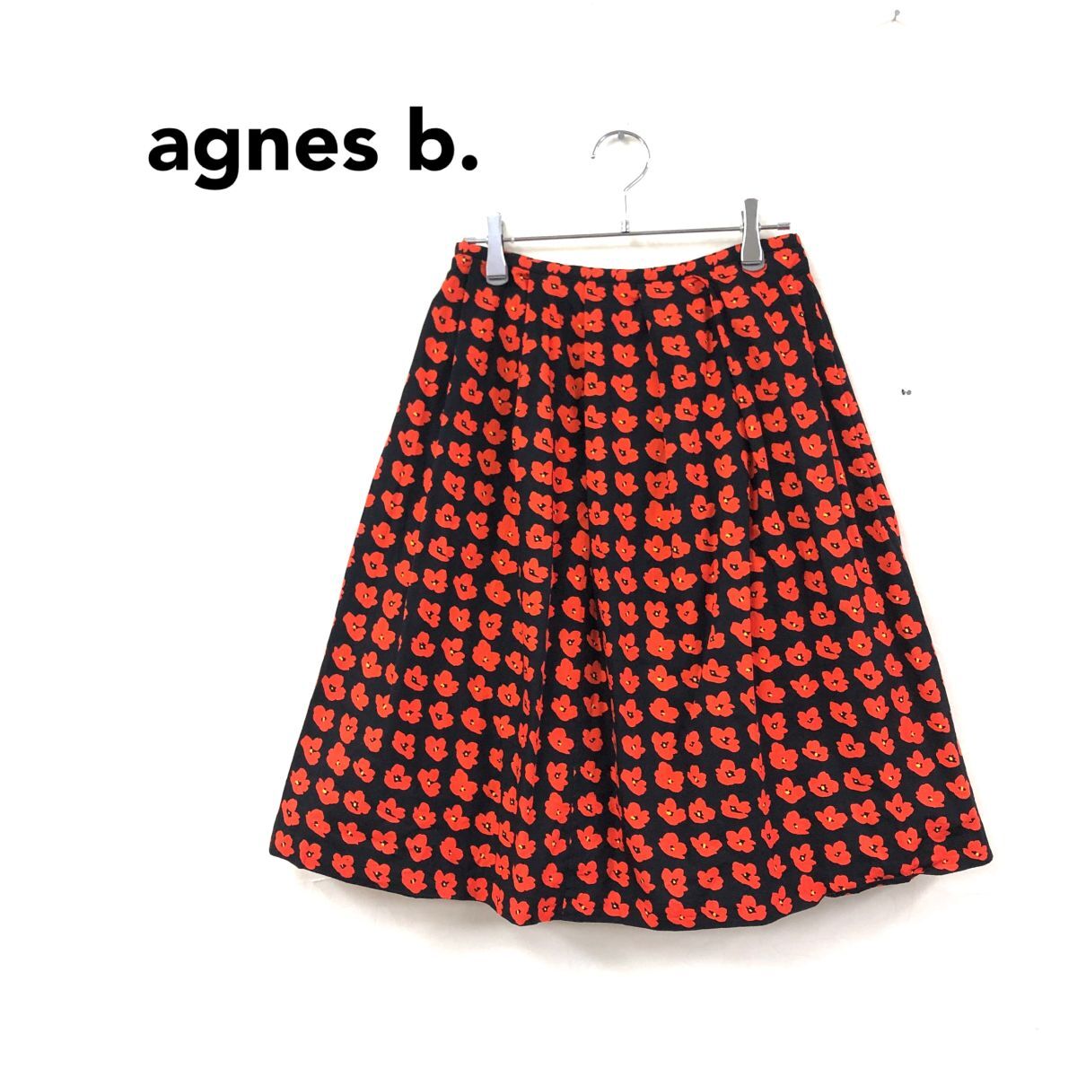 2H2567-Y◆agnes b. アニエスベー 花柄フレアスカート 膝丈 プリーツ 総柄 ウエストボタン レディース ◆size38 レッド ブラック 綿