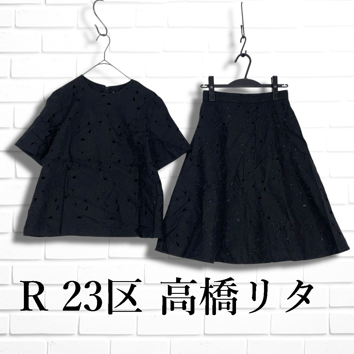 良品 R 23区 高橋リタ アール リネン 麻 100% サマー セットアップ 花 刺繍 半袖 プルオーバー ブラウス スカート 黒 レディース 4315H◎