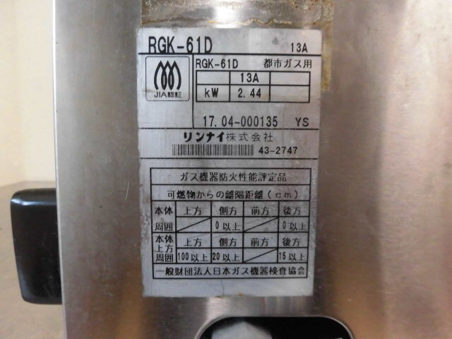 中古厨房 リンナイ 業務用 串焼61号 遠赤外線 下火式 ガスグリラー RGK-61D 都市ガス 圧電式 串焼き機 焼き台 焼き鳥 2017年製
